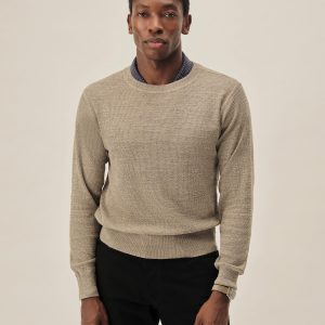 Classic fit short sleeve sweater tee with a straight hem. Yarn-dyed 16 gauge cotton jersey features light slub texture. Features double layer 1×1 ribbing at the collar and rib finishing at the cuffs and hem. Constructed with hand-linked seams for improved durability.
