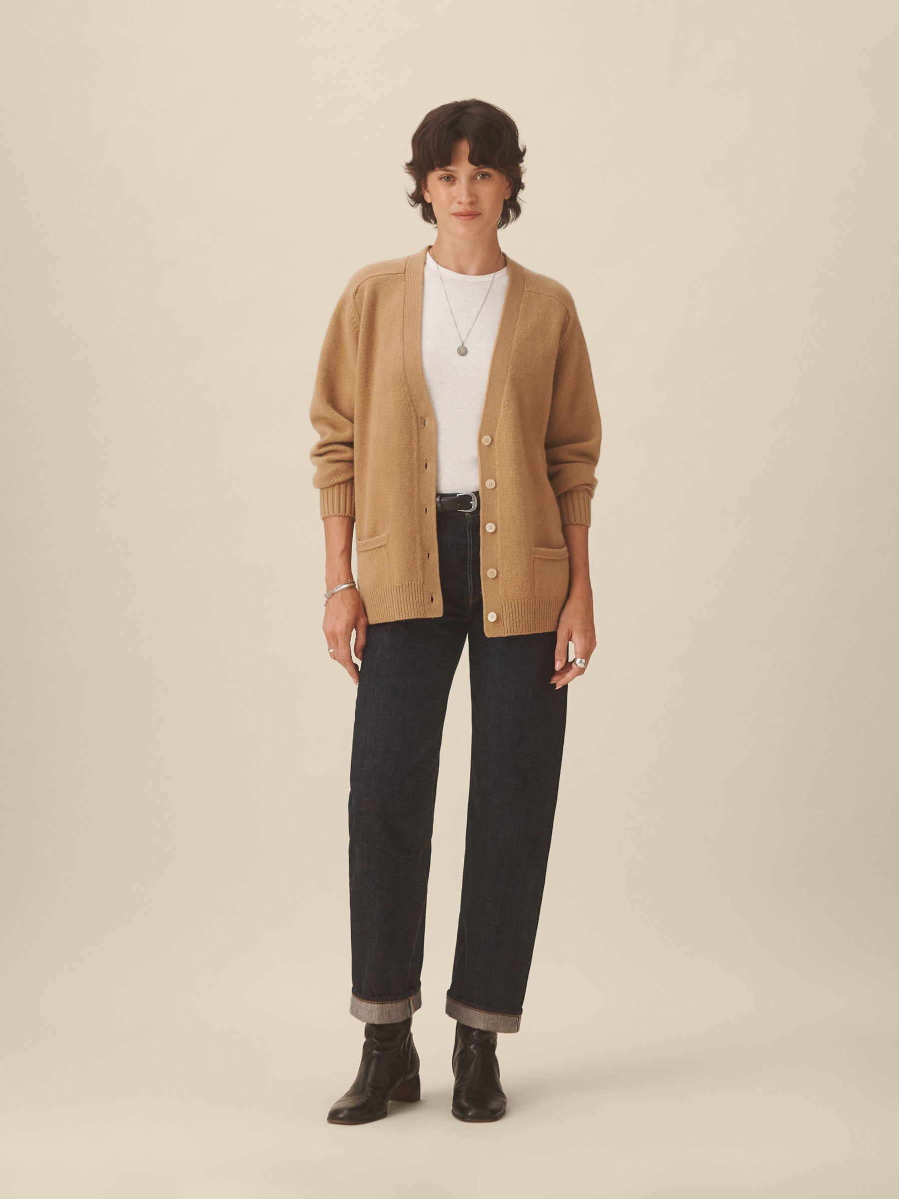 Inspired by vintage “grandfather” cardigans, a sweater made from 100% cashmere in a soft jersey stitch with natural drape and structure. Designed with an oversized fit and saddle armholes, it’s finished with rib trims at the cuffs and hem, functional buttons at the center front, and cleanly finished pockets.