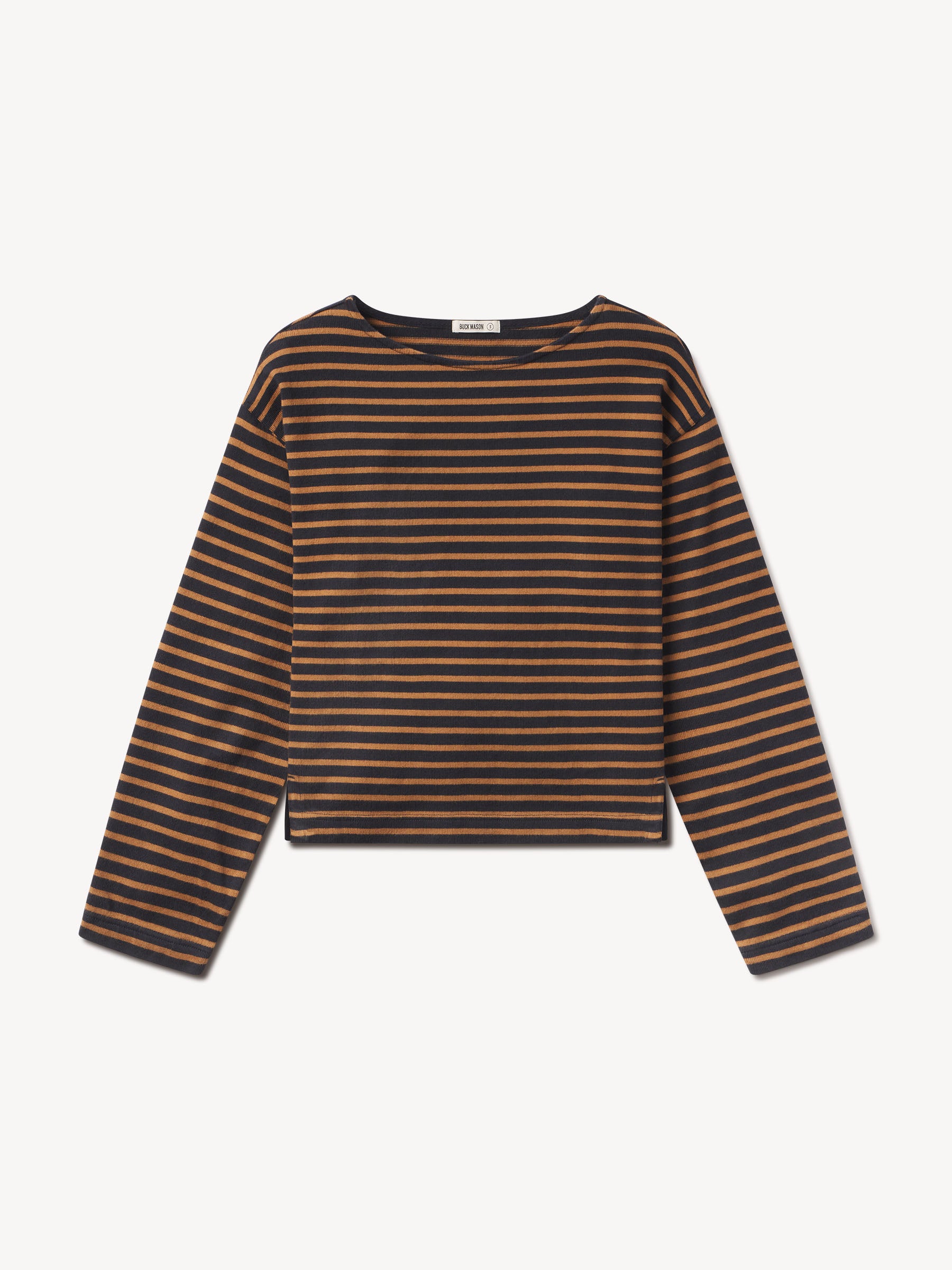 Relaxed long sleeve boatneck tee inspired by the classic French breton shirts. Cut from sturdy, compact 350 GSM cotton. Details include a taped boatneck neckline and side slits at the hem. Constructed with flatlock stitching throughout and double needle coverstitching at the hem. Garment washed for a lived-in feel.