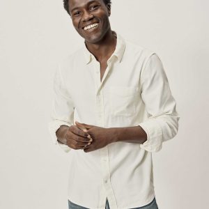 Slim fit long sleeve button up shirt in 5.25 oz. cotton/rayon twill with a subtle luster and an easy drape. Details include mother of pearl buttons, a single spade pocket at the chest, and a box pleat at the back yoke. Constructed with single needle topstitch detailing with double needle stitching at the collar and cuffs. Garment washed with softener for a lived-in feel.