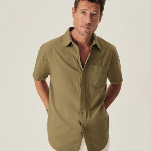 Roomy up top and slim through the body, this lightweight short sleeve button up has a relaxed drape. A casual classic featuring shell buttons and a mid-length hem that looks great tucked or untucked.