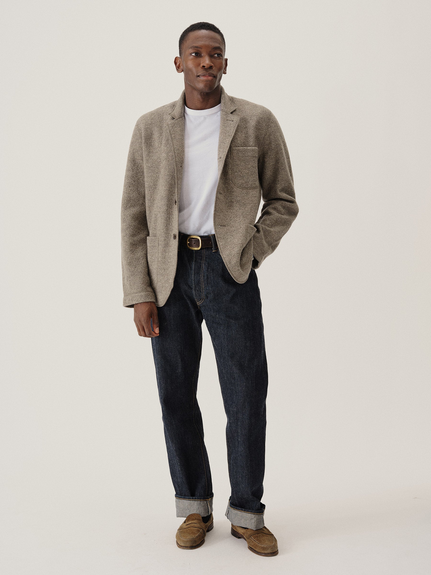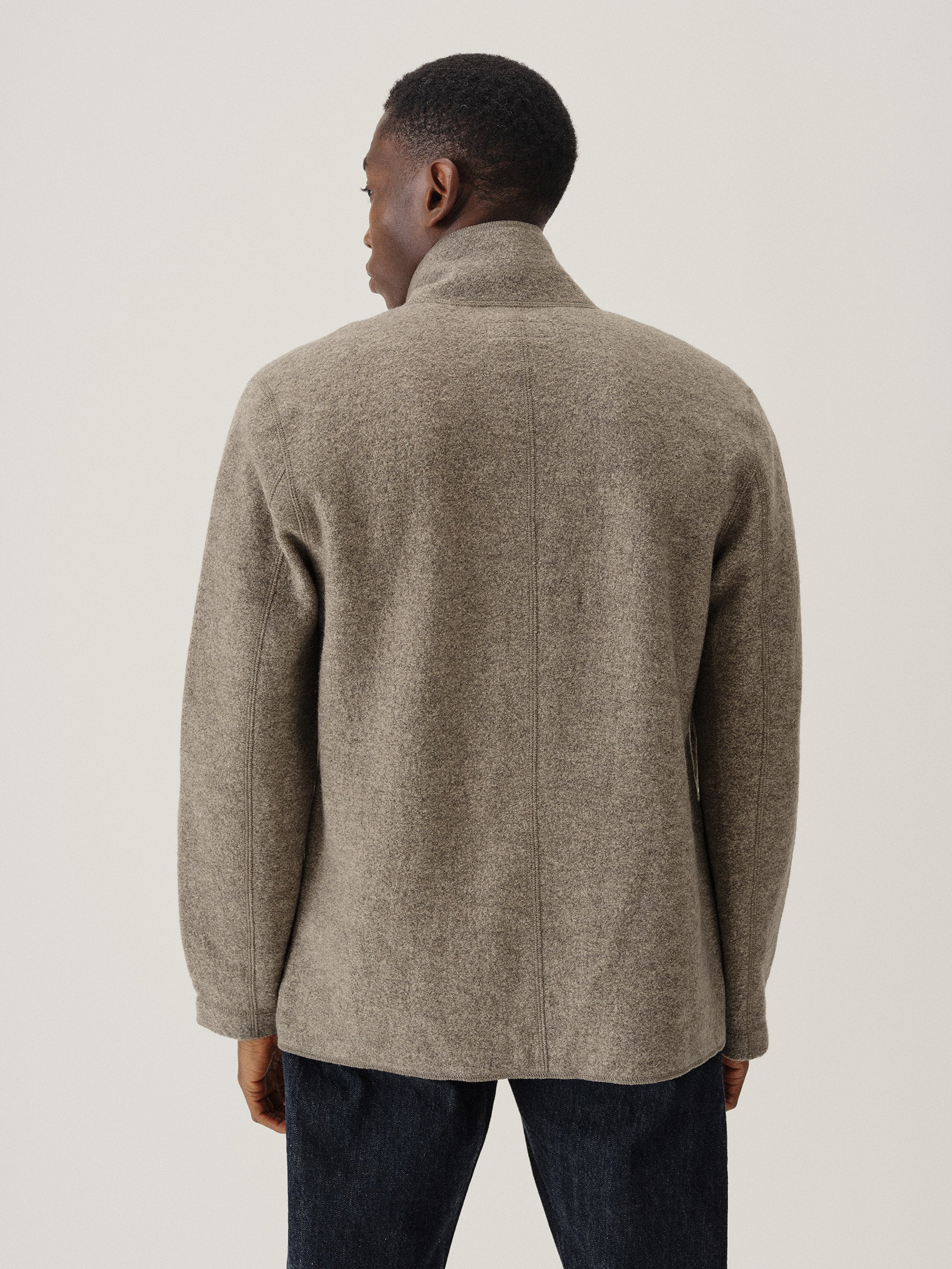 Classic fit chore coat with a slimmer cut through the arms and room in the torso for layering. This 340 GSM felted merino wool has been twice boiled for improved insulation and durability. Details include three patch pockets, real horn buttons, and a notch collar. Constructed with hand-sewn facings and cover-stitching throughout.
