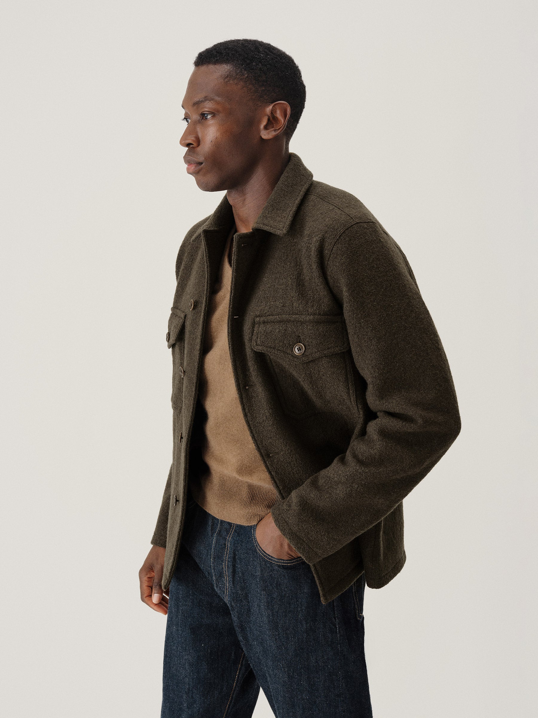 Classic fit field shirt in 340 GSM felted merino wool, twice boiled for improved insulation and durability. Details include patch-and-flap chest pockets and a button front closure. Constructed with hand-sewn facings and cover-stitching with flat seams for comfort.