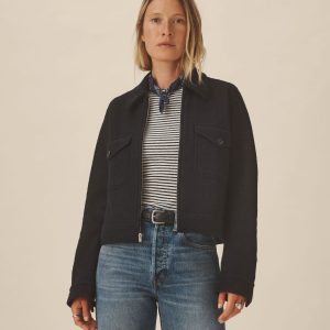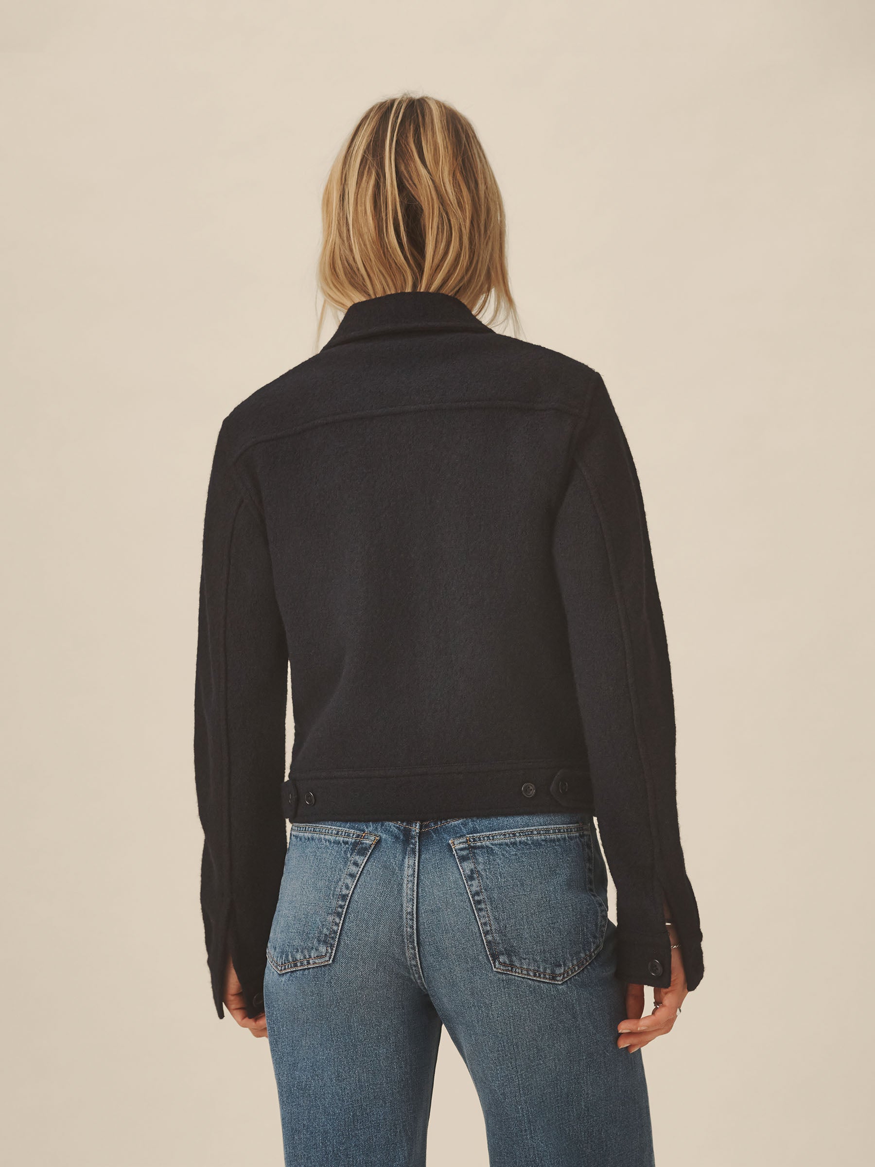 Relaxed utility jacket inspired by vintage mechanic uniforms. Cut from structured 340 GSM felted merino wool, twice boiled for improved insulation and durability. Details include a zipper front, chest pockets, and button-through cuffs. Back tabs can be adjusted for a more fitted waist.