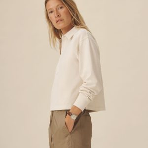 Inspired by the men’s Field-Spec Rugby, the women’s version is cut from 100% cotton in a dense slub jersey with a structured hand. Cut with a cropped, boxy fit and long sleeves, it’s designed with a woven twill collar and placket, tonal poly buttons at the center front, and herringbone-trimmed side slits.
