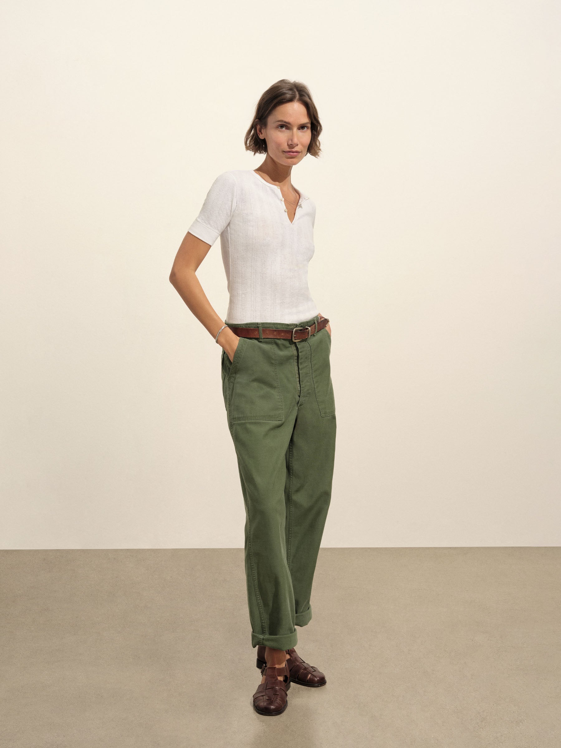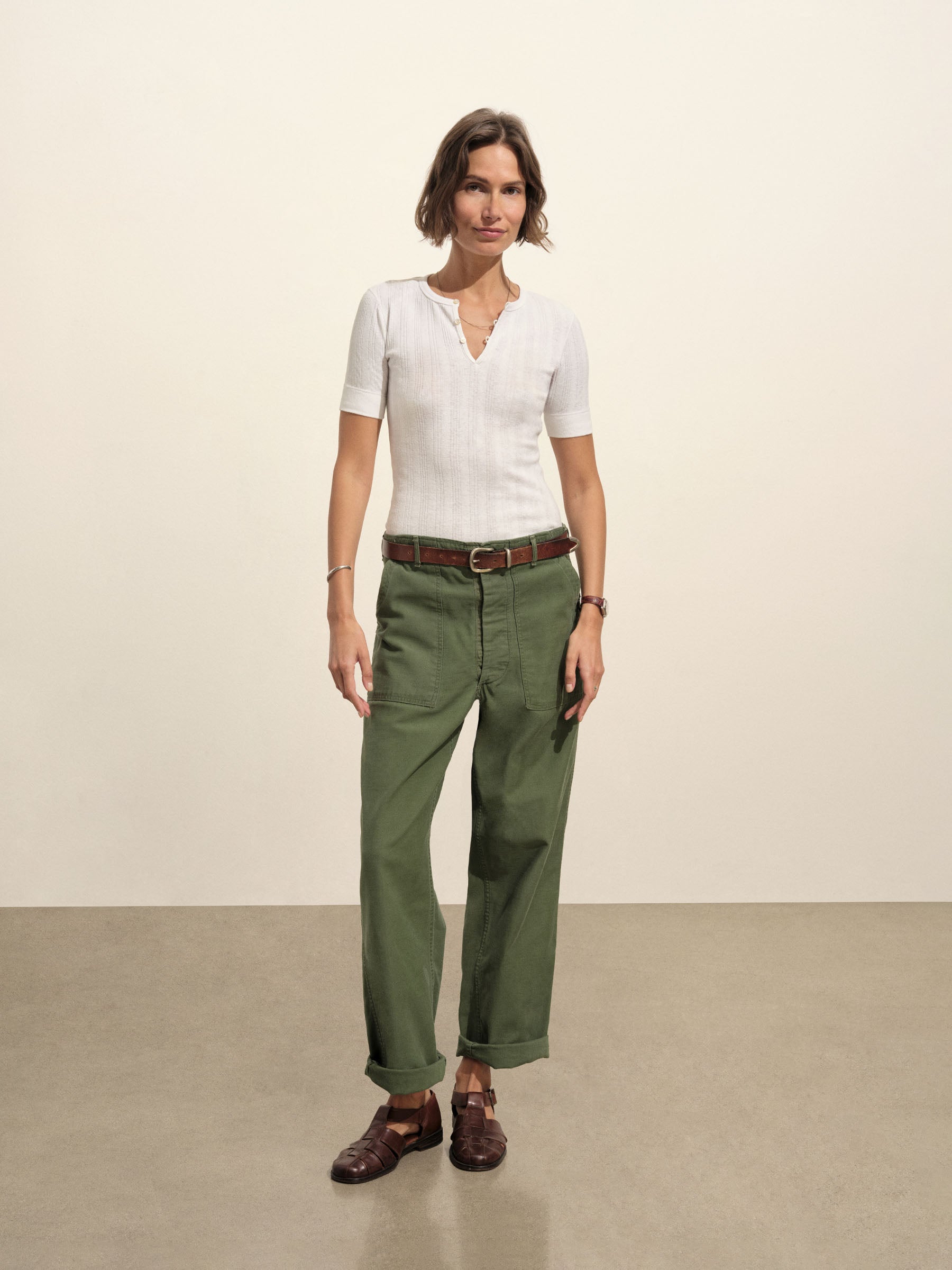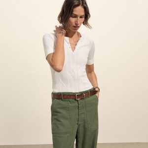 Military-inspired short sleeve henley, crafted from a superfine blend of new and recycled cotton with a subtle, textured rib. Featuring a three-button loop placket and sleeve cuffs. Finished with mother of pearl buttons and garment washed for a lived-in feel.