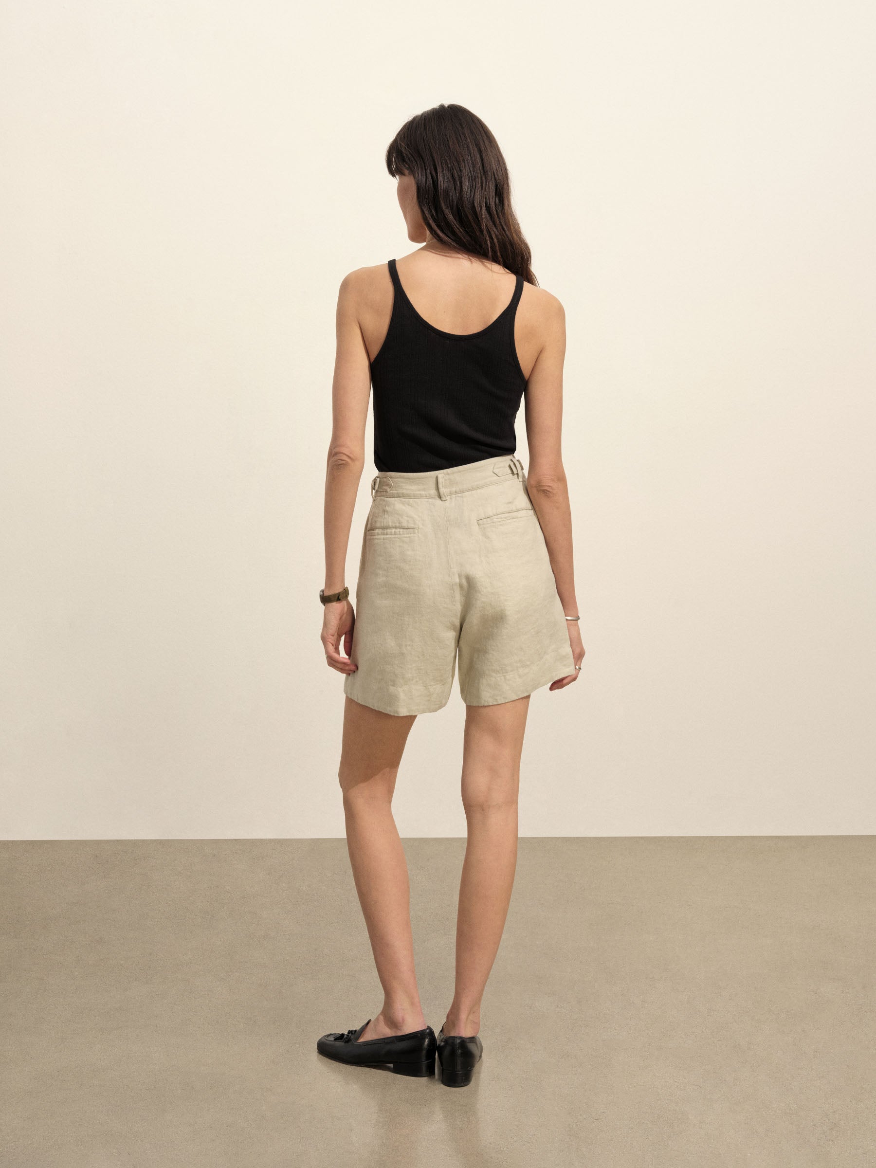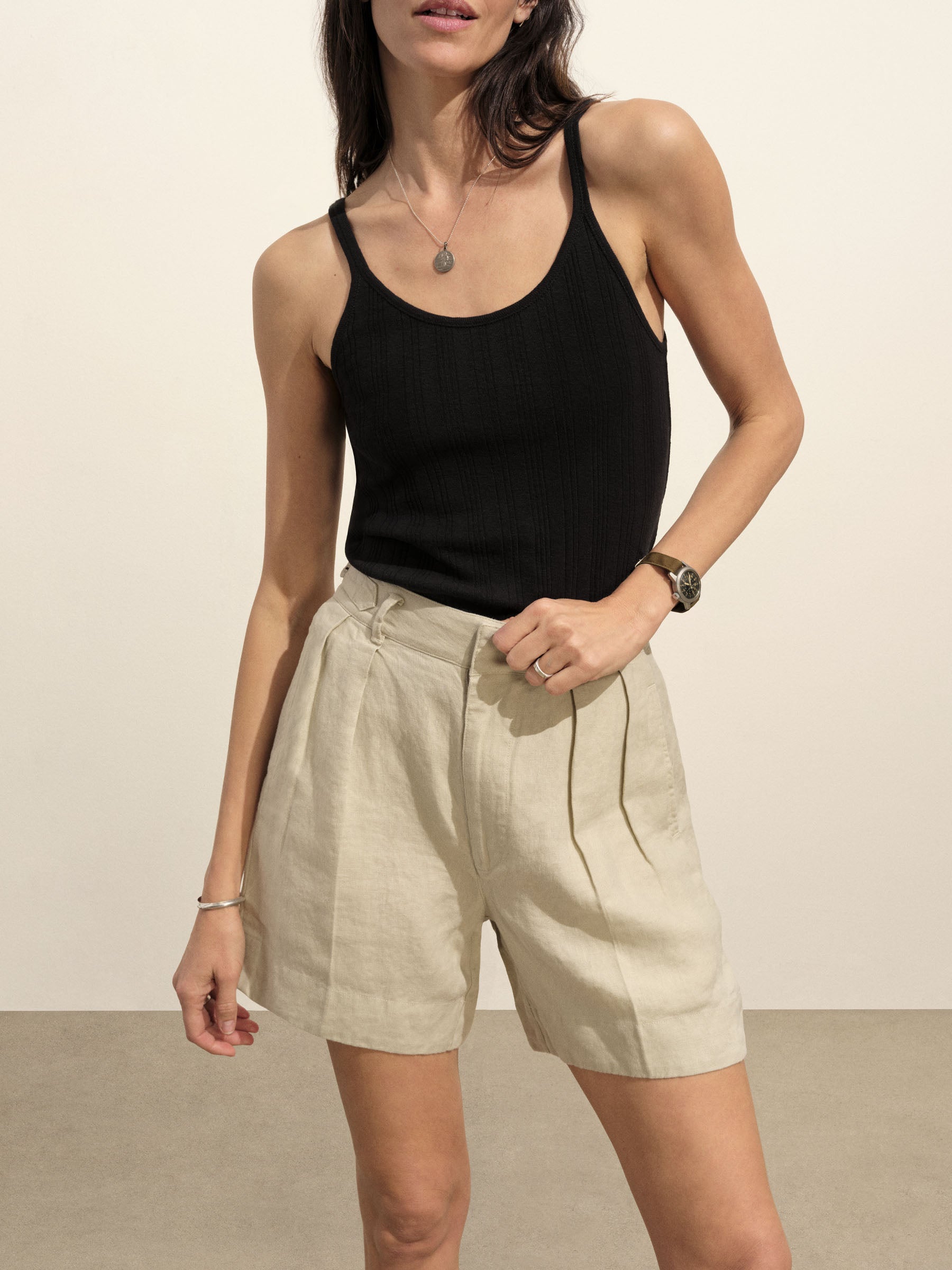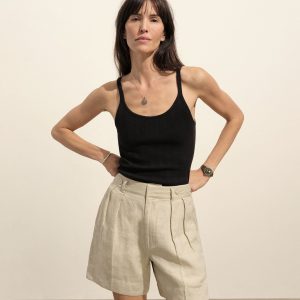 Slim-fit, vintage-inspired base tank made from a textured blend of 60% recycled cotton and 40% cotton. Features a scalloped scoop neckline, contrast rib binding, and discreet baby snaps at the shoulders to keep bra straps in place.