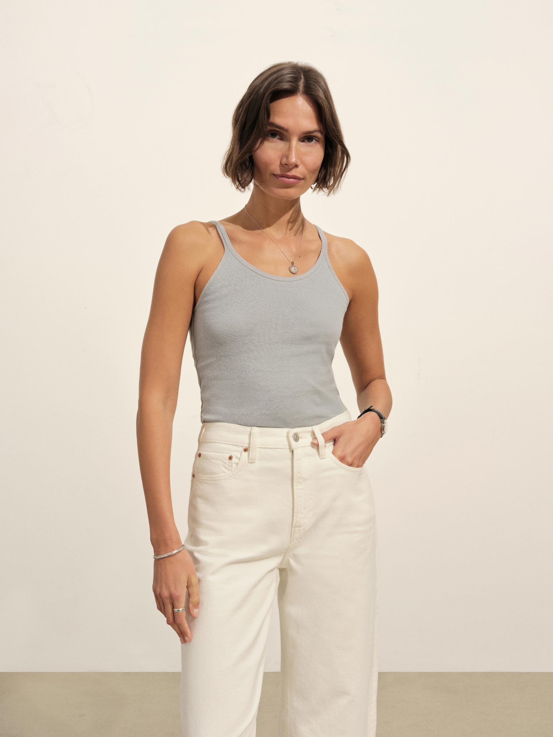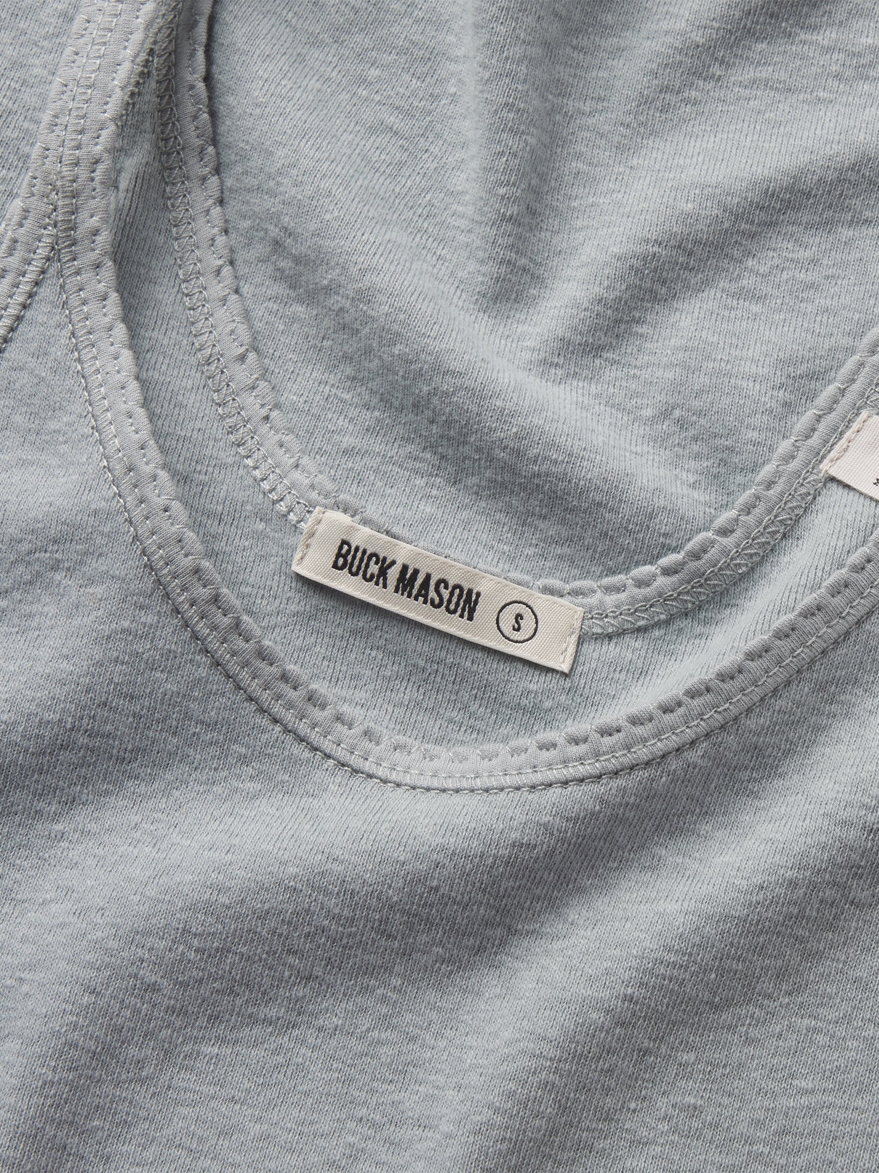 Slim-fit, vintage-inspired scoop tank made from a blend of 60% recycled cotton and 40% cotton. Featuring a combo of jersey fabric and scallop stitch details at the armholes and neckline, it also includes baby snaps for the bra holder.