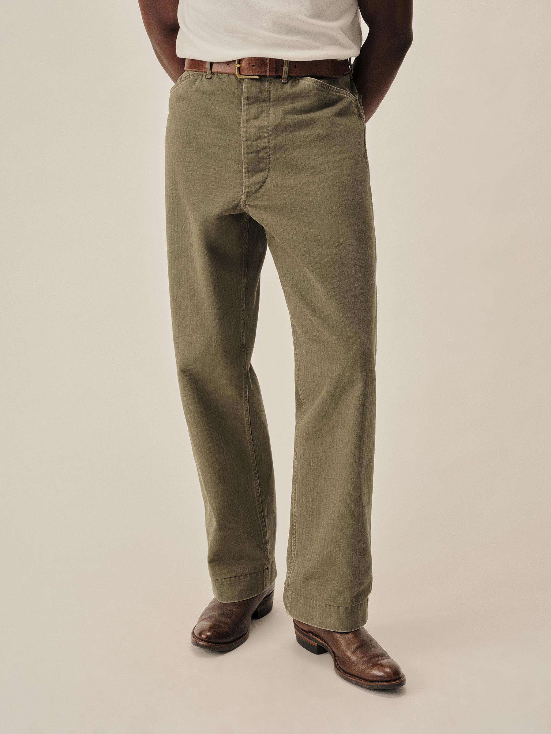 Our Herringbone Twill Field Pant pays tribute to the USMC work trouser turned WWII combat uniform, the P-41. “Repro” style fit with a high rise and full leg, cut from lightweight, 100% cotton HBT. Construction details include felled seams, 2 open back patch pockets, and bar tacks at points of stress. Stonewashed for a broken-in, vintage feel.