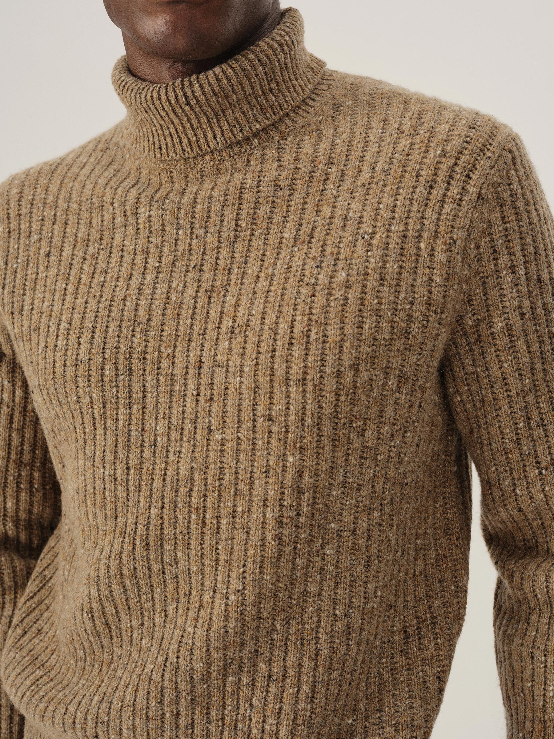 Classic fit long sleeve turtleneck sweater in light and breathable 9-gauge Italian yarn-dyed wool blend finely knit in a ribbed pattern with multicolor flecks reminiscent of Donegal tweeds. Constructed with fashioning at the shoulder and armhole and finished with a ribbed collar, cuffs, and hem. Lightly brushed for a softer hand.