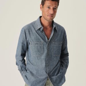 Classic fit work shirt cut from 5 oz indigo yarn-dyed chambray. Details include tonal buttons, two chest pockets, and run off stitching at the side gussets. Constructed with clean finished seams. Garment washed for a lived-in look and feel.