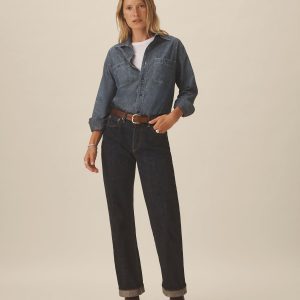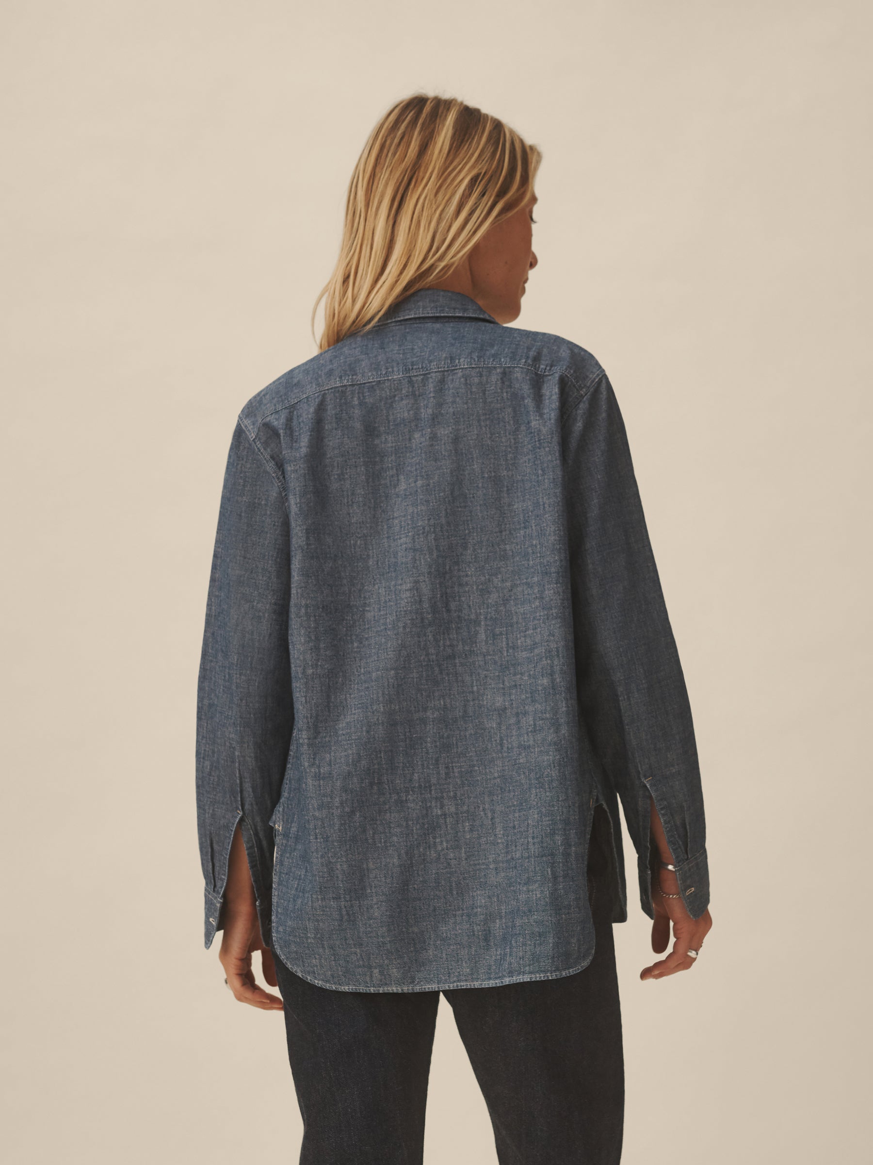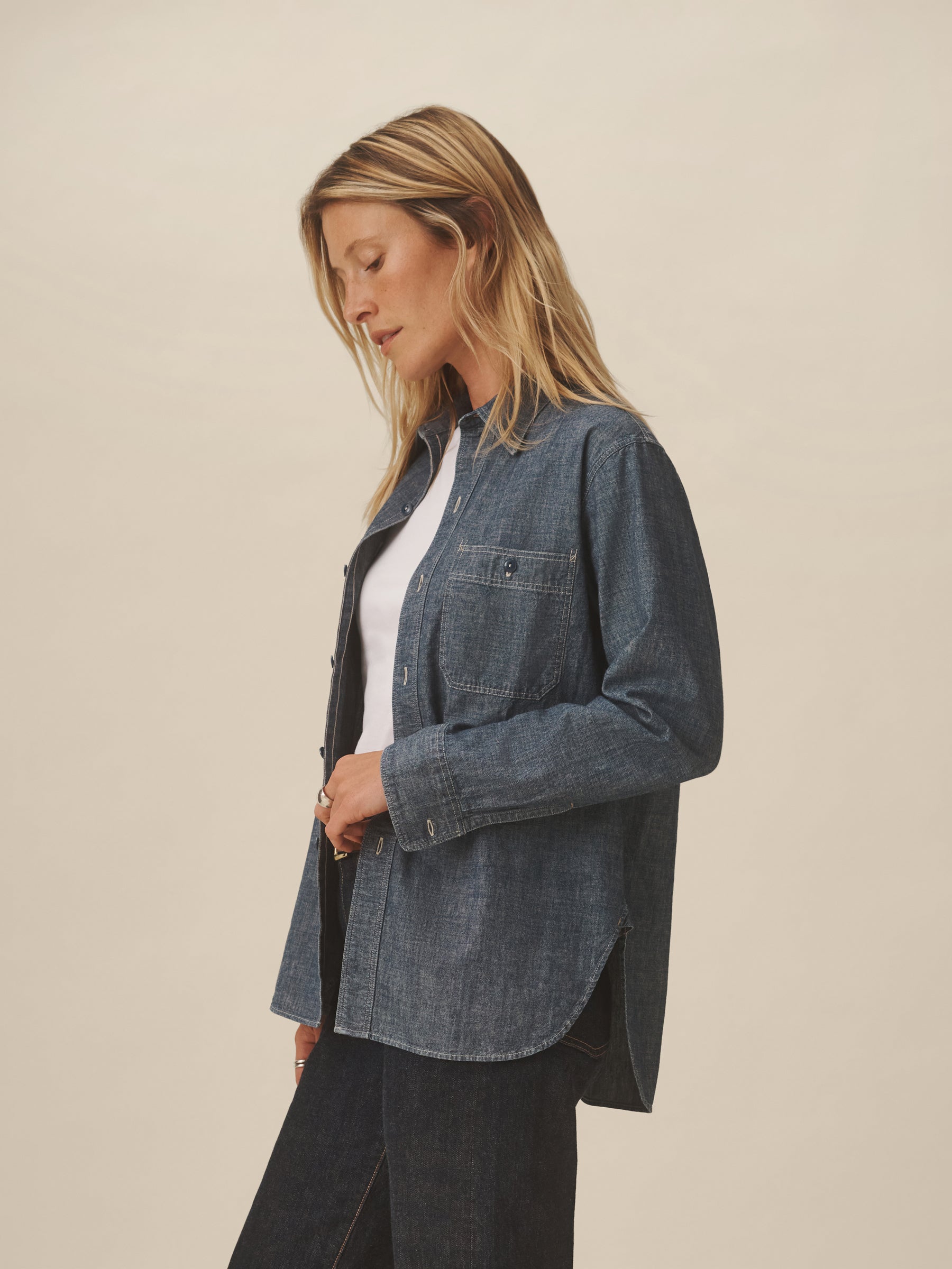 A work shirt cut from lightweight, yarn-dyed Japanese chambray. Modeled after 1950s workwear styles, it’s constructed with twin button-through chest pockets, durable felled seams, tonal 2-hole poly workwear buttons, and run-off stitching at the side gussets. Reinforced with discreet bartacks throughout.