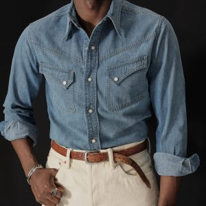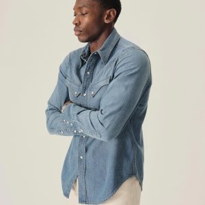 A slim fitting, tailored take on western shirts from the early 1950s. The angled front yoke, extending all the way to the center front placket reinforces the top half, just as it did for ranchers and cowboys. Constructed with felled seams and chain stitching to enhance strength and durability. Finished with pearl snaps and a wash that carefully details the character and texture of a decades old classic.