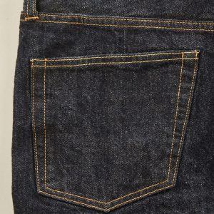A classic 5-pocket jean in our Ford Standard fit: mid-rise, straight through the thigh with a taper below the knee. Inspired by blue jeans from the 1940s through the 1960s, this shuttle loomed 14 oz. selvedge denim is unsanforized, and has an organic texture that develops more character with every wear. Garment rinsed for a lived-in feel. Details include copper rivets and a metal tack button fly.