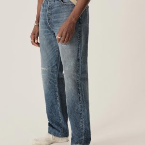 A classic 5-pocket jean in our Full Saddle fit: high-rise, straight through the thigh and leg. Inspired by blue jeans from the 1940s through the 1960s, this shuttle loomed 14 oz. selvedge denim is unsanforized, and has an organic texture that develops more character with every wear. Garment rinsed for a lived-in feel. Details include copper rivets and a metal tack button fly.