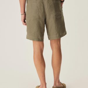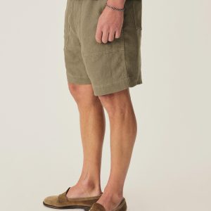 Classic fit fatigue short. This 7 oz. linen has a loose, airy weave that breathes easily, and it’s been washed for a lived-in feel. Details include two front patch pockets, two back patch pockets, an encased elastic waist with drawcord, and corozo buttons. Garment washed with enzymes and softener for a lived-in feel. Button and zip closure.