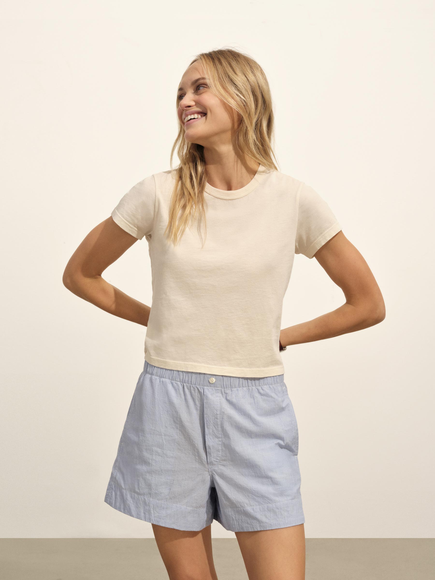 Pull-on shorts inspired by men’s military boxers, made from 2.8 oz. cotton plainweave. Relaxed, high rise fit with a 4” inseam. Featuring faux button and zip fly, an elastic waistband, on-seam side pockets, and back patch pockets. Finished with a mother of pearl buttons and garment washed for a broken-in feel.