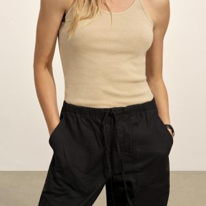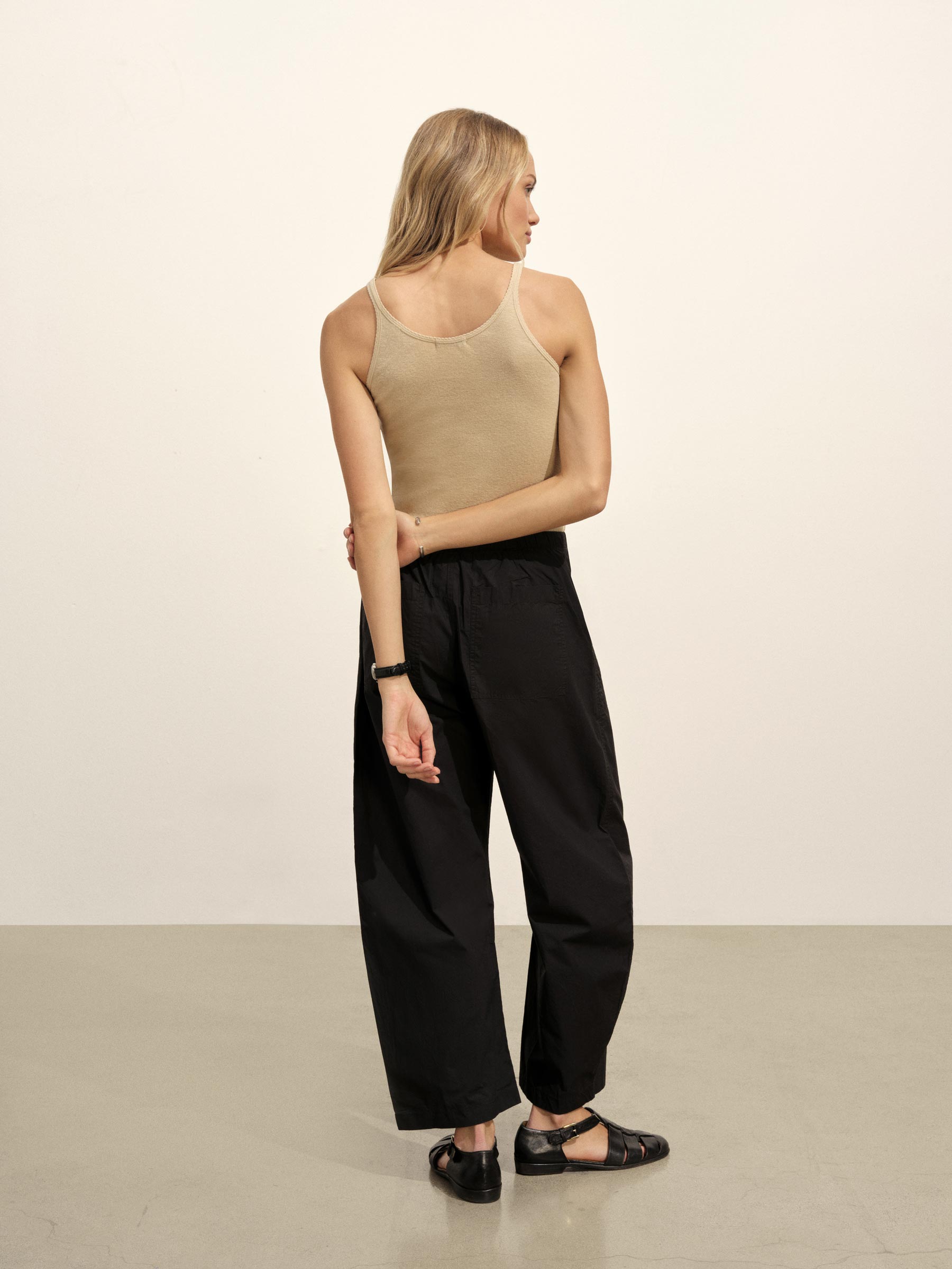 High-rise, military-inspired pant crafted from lightweight cotton poplin with a cropped, 27” inseam and curved barrel legs. Details include two front baker pockets and back patch pockets. Finished with corozo buttons, a zipper fly, and a metal hook and bar with a self-adjusting elastic waistband. Garment-washed for a lived-in feel.