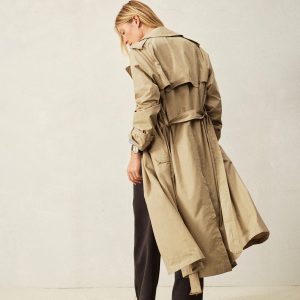 Relaxed trench coat cut from lightly structured 5.5 oz. cotton poplin. Featuring a double-breasted front, gun flap, storm flap, and raglan sleeves with adjustable belts. Detailed with horn/urea buttons, a throat latch with adjustable closure, leather buckles and prongs, and embroidery eyelets. The collar is finished with trapunto stitching, while the interior boasts a half lining for comfort.