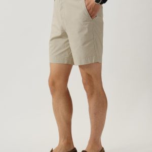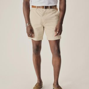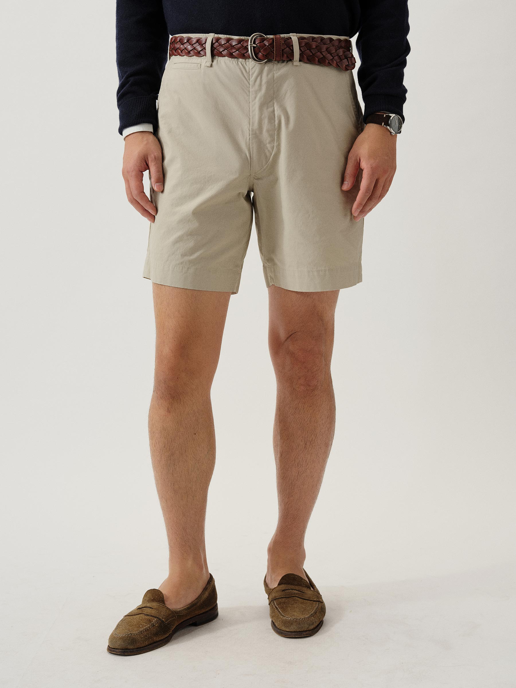 Easy tailored officer short with a tapered leg and 6.5″ inseam. This 5.5 oz. cotton poplin has a crisp hand and light structure suitable for warmer climates. Vintage army chino-inspired details include a Hollywood waistband, slash hip pockets, two single welt back pockets (one of which has a button closure), and a single welt coin pocket. Garment washed with enzymes and softener for a lived in feel. Zip fly with waist button closure.