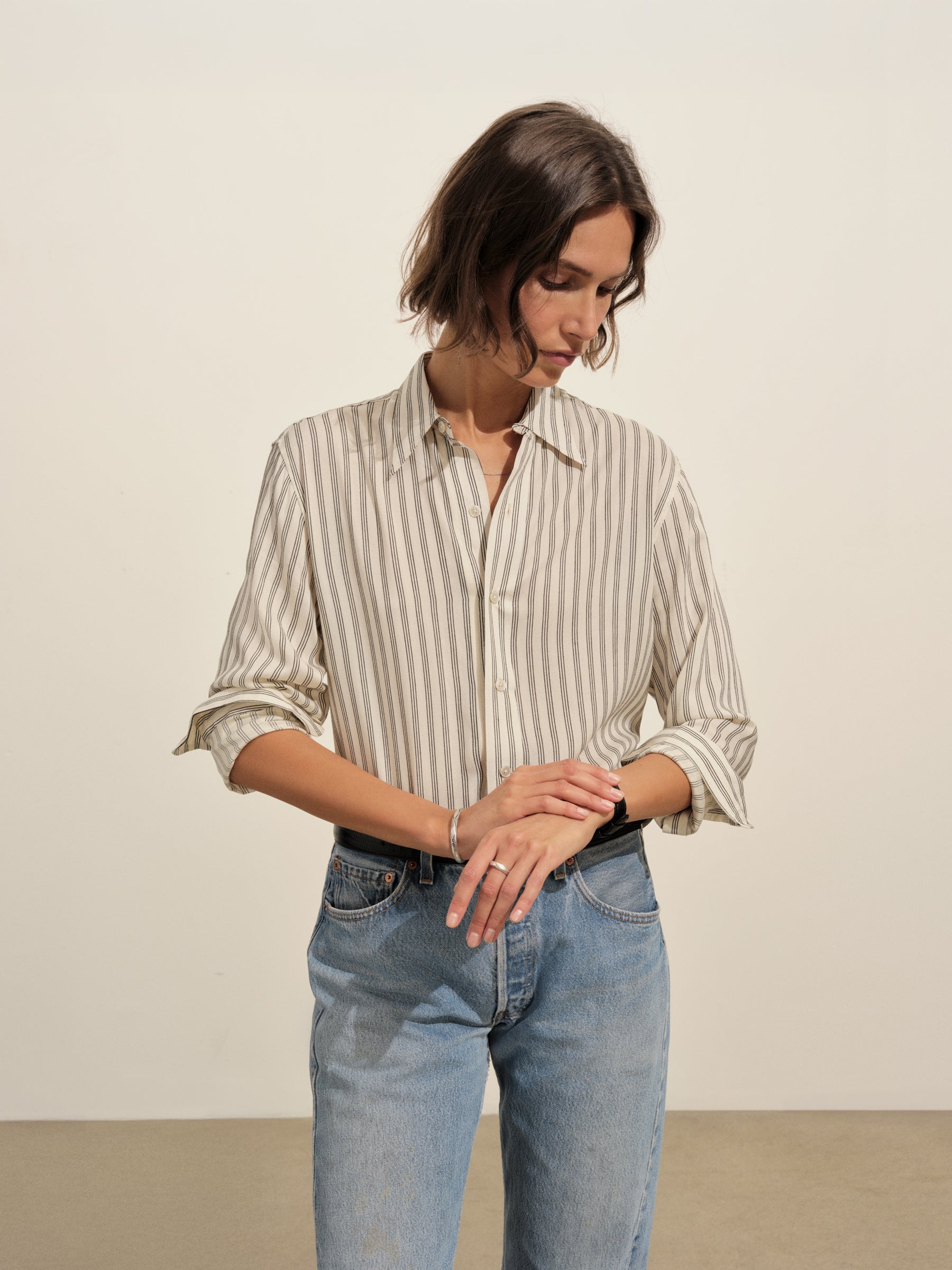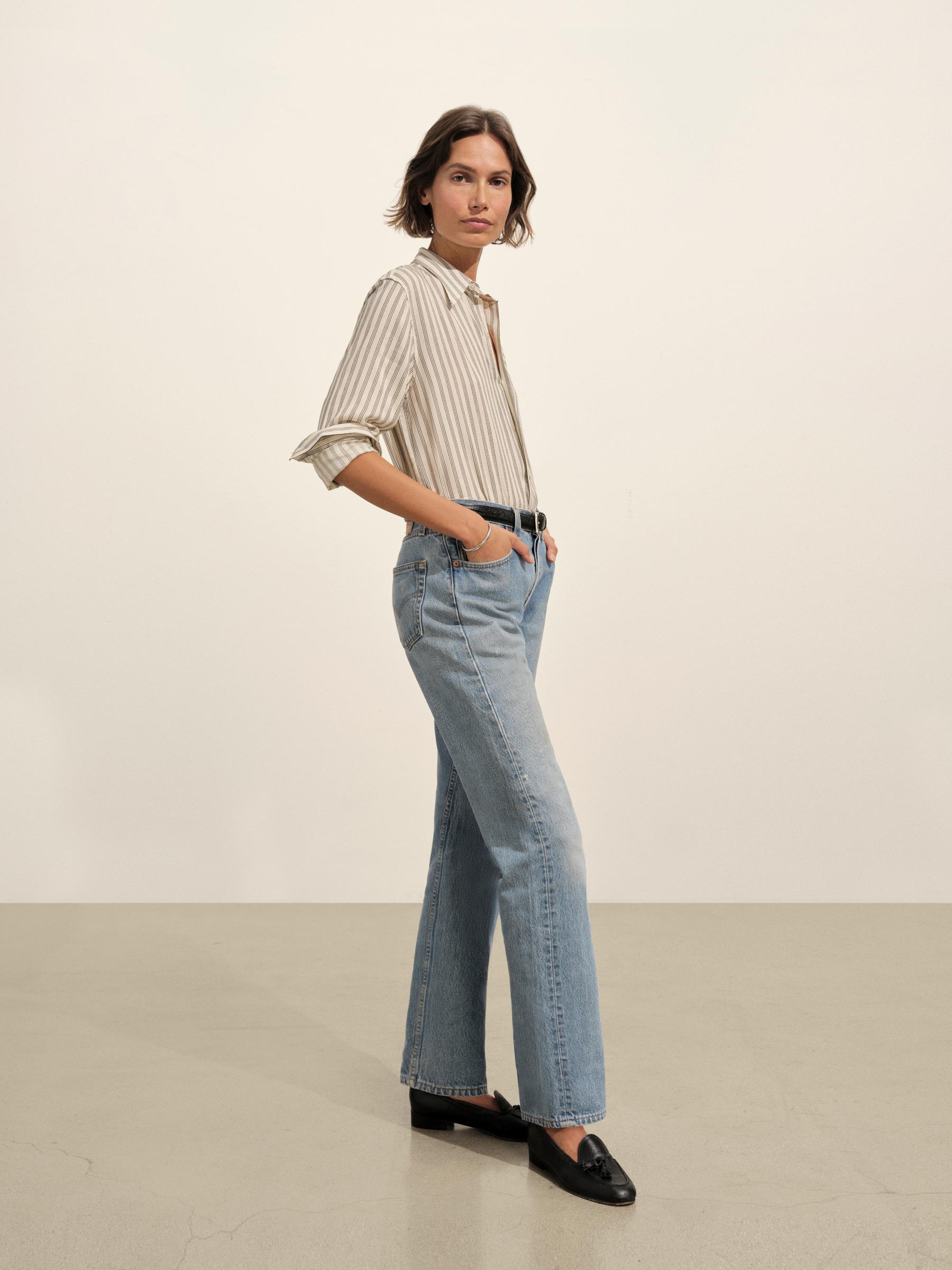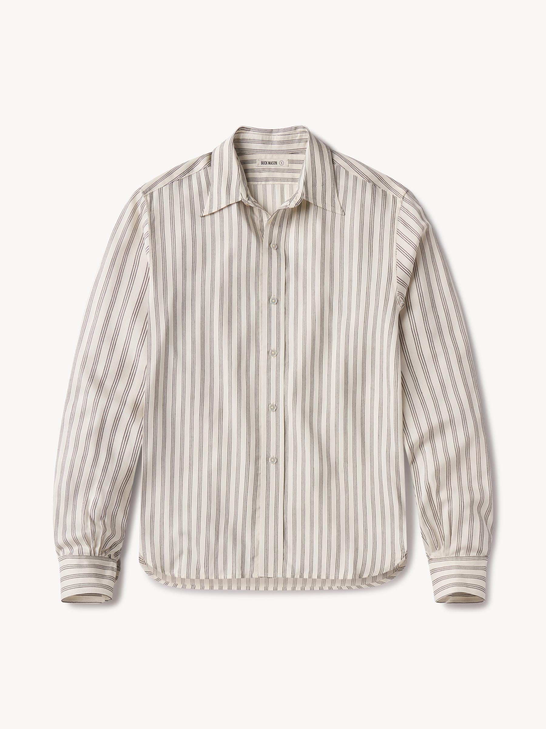 A modern take on men’s sportswear shirts from the 1940s, a relaxed button-down shirt in a silky rayon jacquard weave. Featuring a carved collar, side-seam gussets, button-through plackets along shirt front and sleeves, and pintuck detailing on back yoke and sleeve cuffs. Finished with side-seam gussets and mother of pearl buttons.