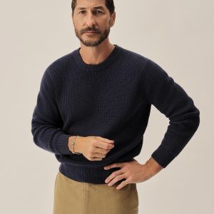 Classic fit fisherman’s cardigan sweater in a homespun textured cotton rib with two patch front pockets and a 5-button front closure. Constructed with hand-linked seams, double layer ribbing at the front placket, and racking stitch detailing at the cuffs.