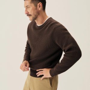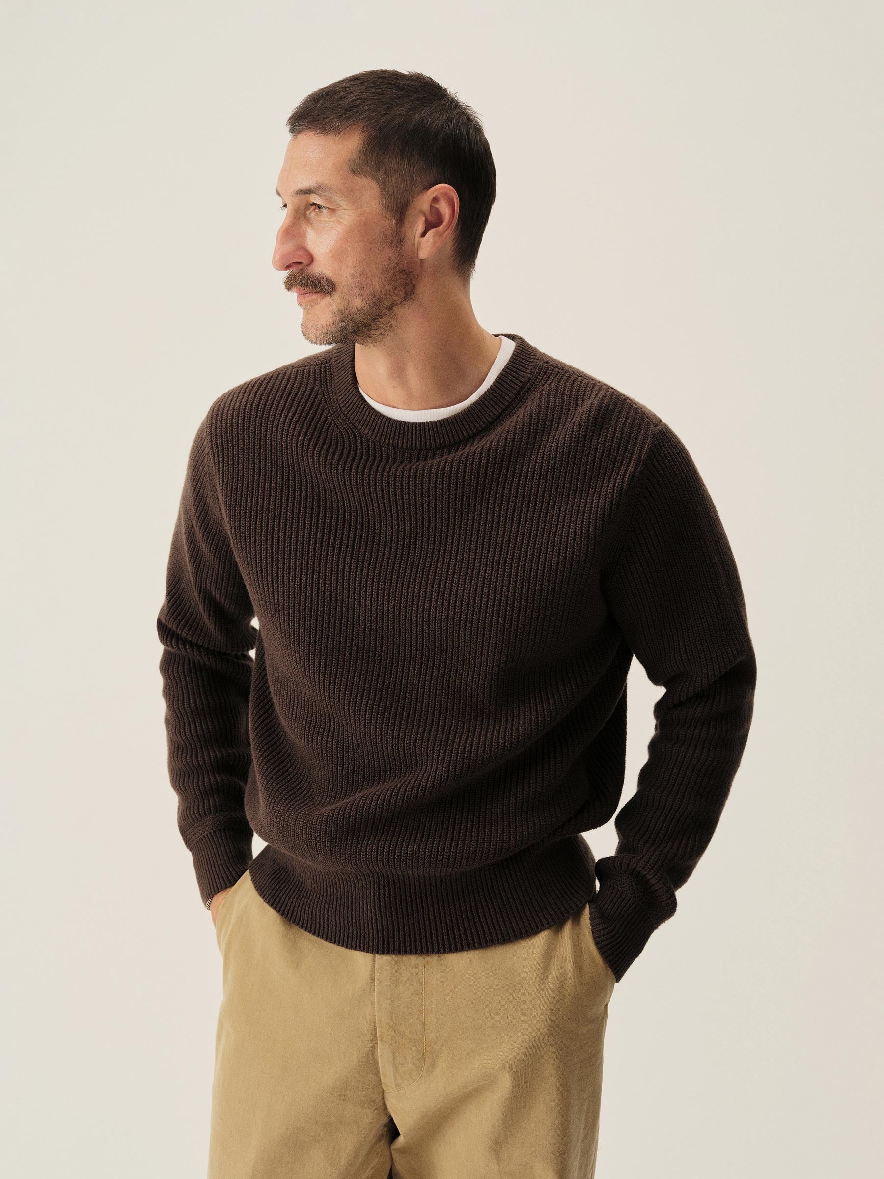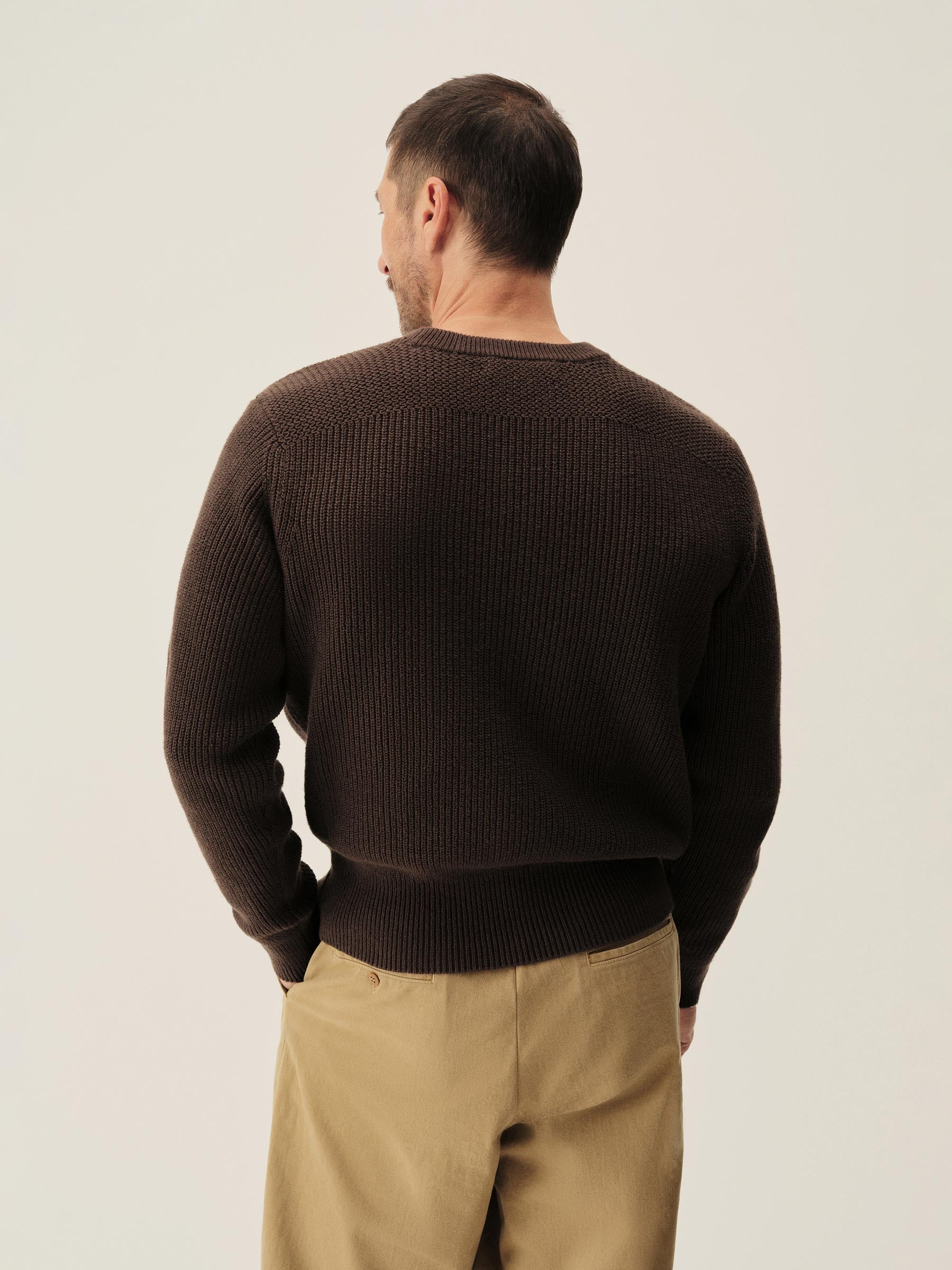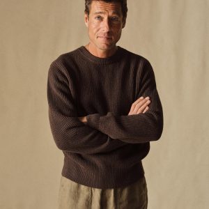 Classic fit crewneck sweater in a homespun textured cotton rib. Constructed with hand-linked seams, double layer ribbing at the collar, and racking stitch detailing at the cuffs.