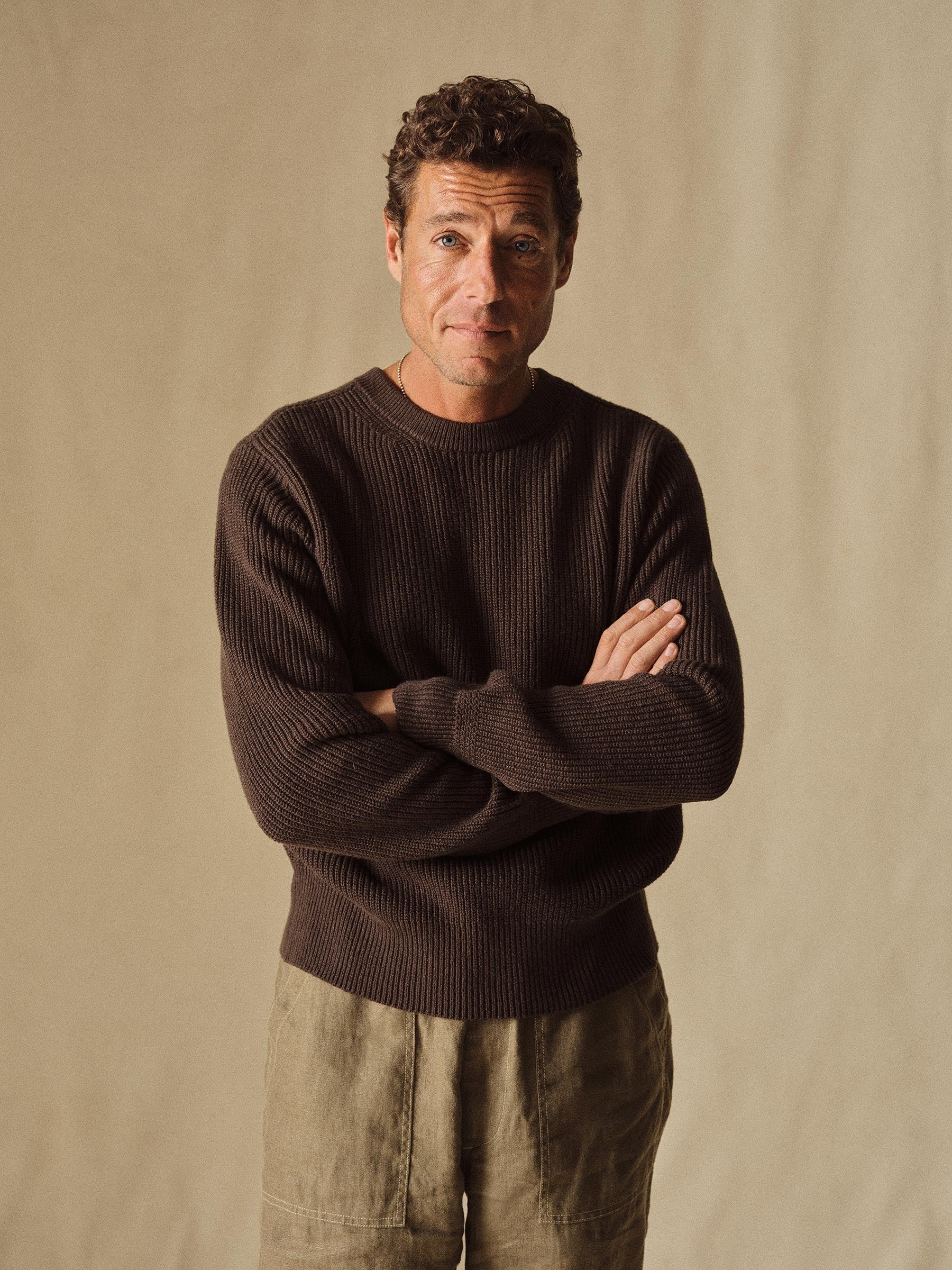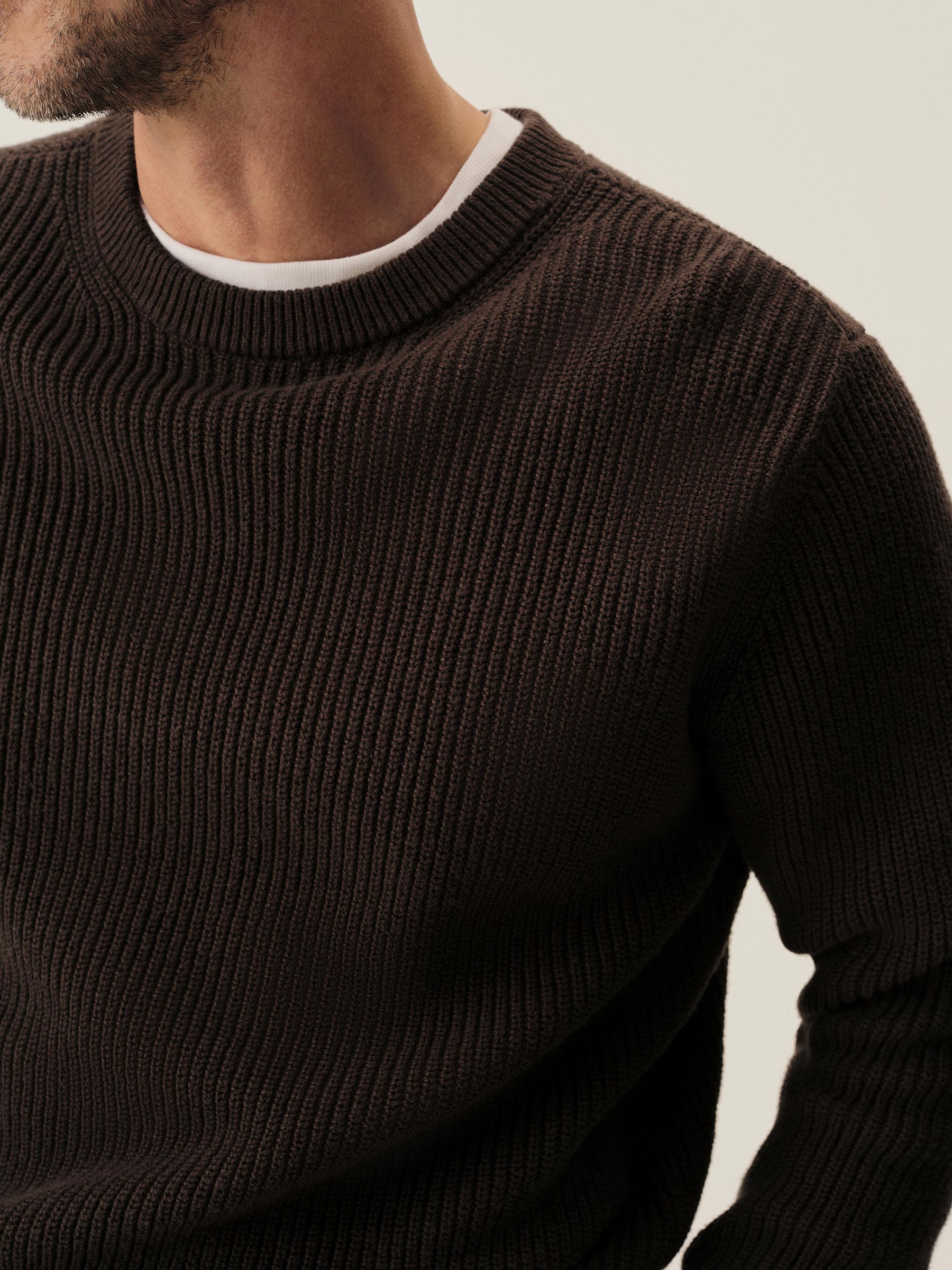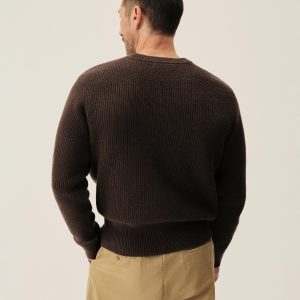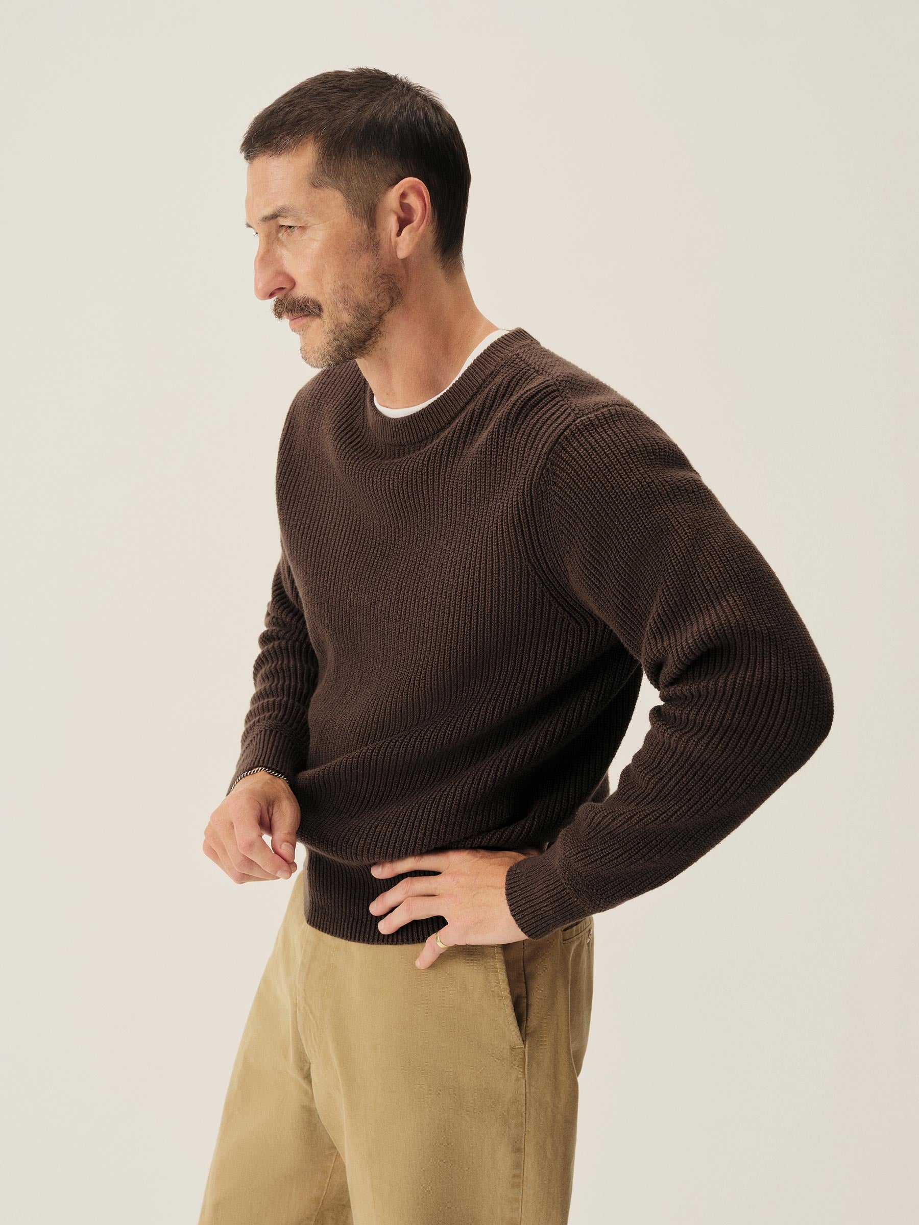 Classic fit crewneck sweater in a homespun textured cotton rib. Constructed with hand-linked seams, double layer ribbing at the collar, and racking stitch detailing at the cuffs.