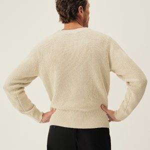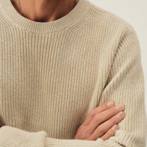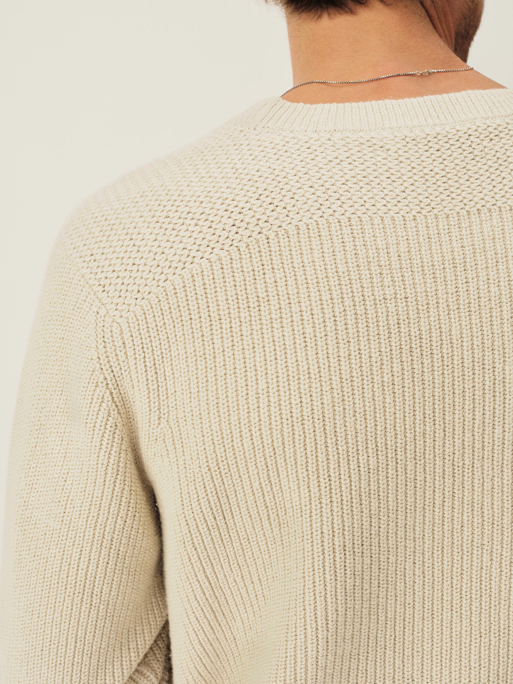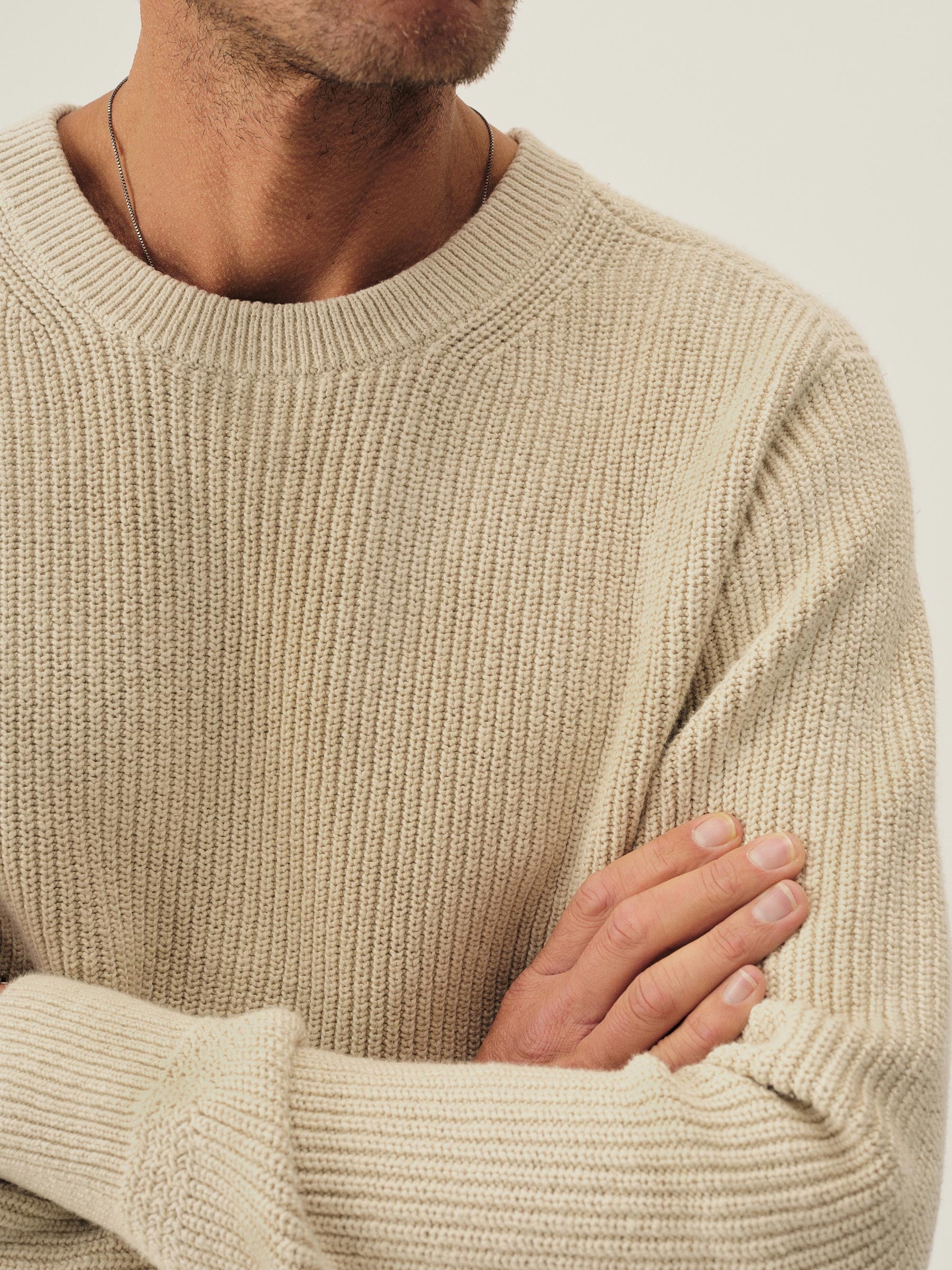 Classic fit crewneck sweater in a homespun textured cotton rib. Constructed with hand-linked seams, double layer ribbing at the collar, and racking stitch detailing at the cuffs.