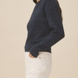 1960s inspired crewneck sweater with an easy, slim fit. Crafted from 7-gauge waffle knit yarn-dyed cotton with a light slub texture, featuring fashioning at the neck and drop-back shoulders as a nod to mid-century.