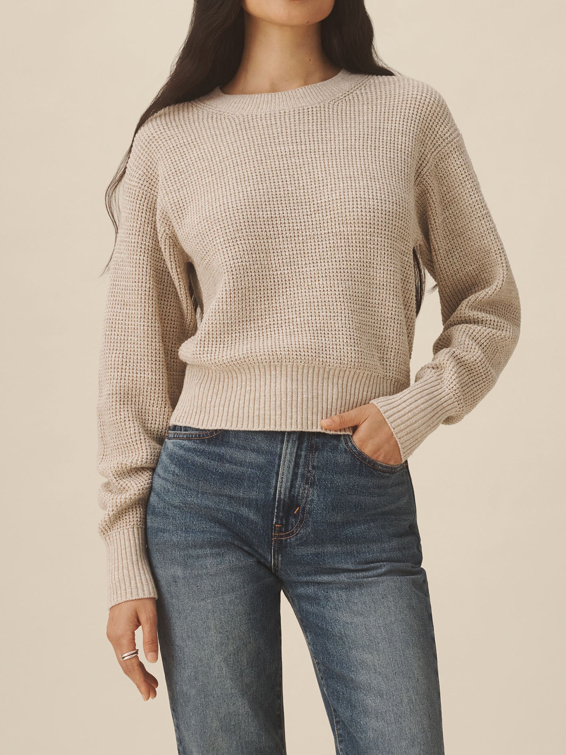 1960s inspired crewneck sweater with an easy, slim fit. Crafted from 7-gauge waffle knit yarn-dyed cotton with a light slub texture, featuring fashioning at the neck and drop-back shoulders as a nod to mid-century.