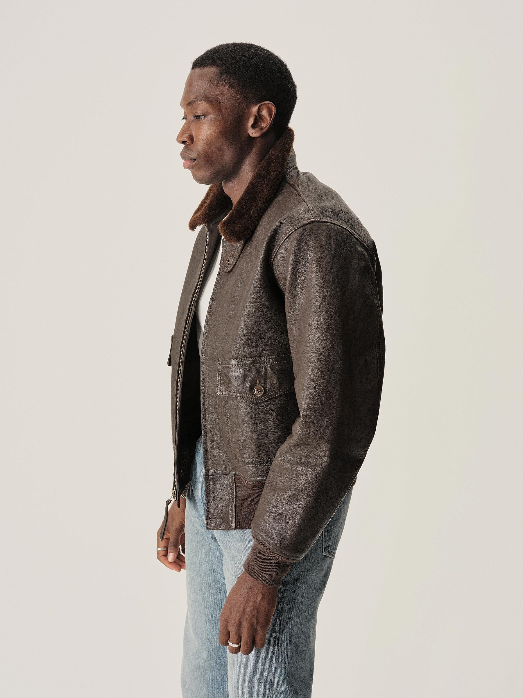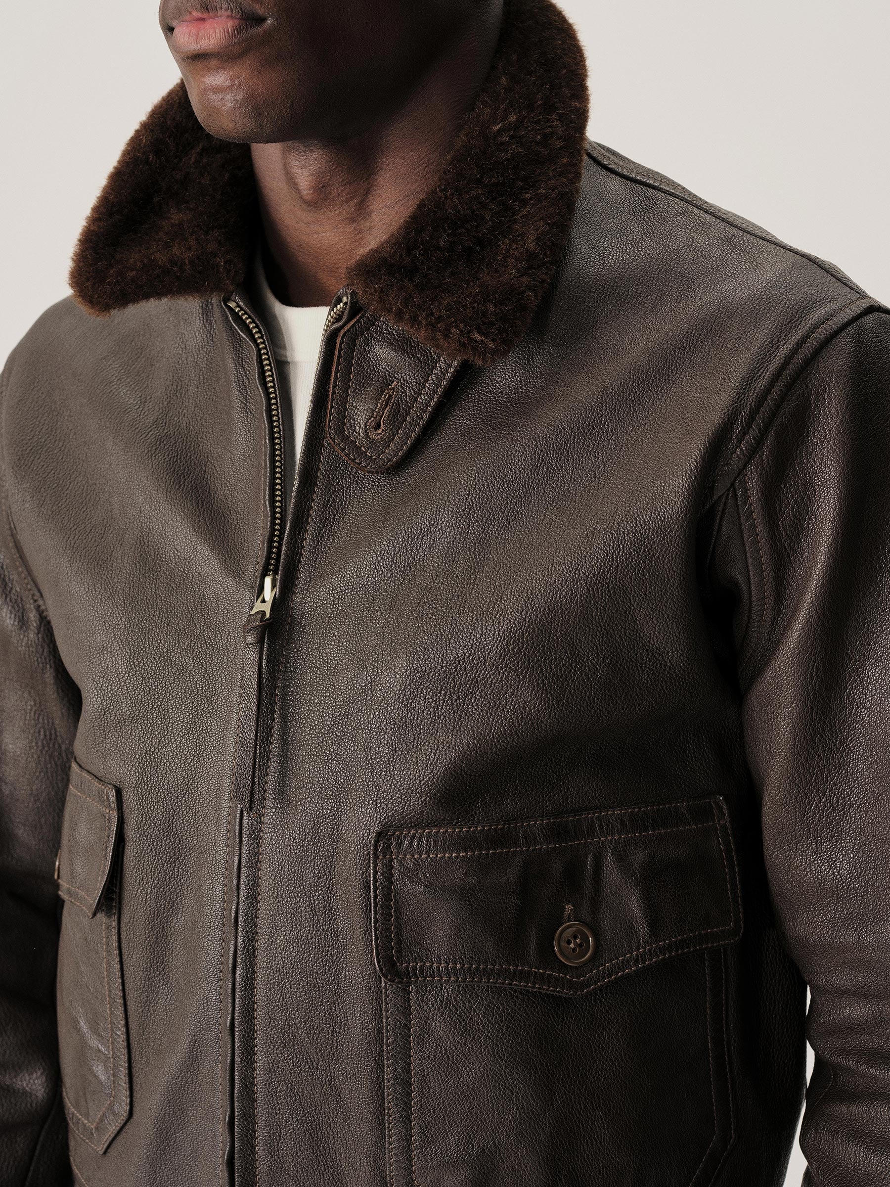 Few icons conjure the golden age of flight like the G-1 jacket, first developed by the US Navy in the 1930s, and we make ours with a vintage fit to match the classics. Crafted like the original with a goatskin body and a shearling fur collar, it will develop a handsome patina as it becomes a heritage piece of its own. The relaxed chest and ribbed details ensure a spot-on mid-century profile with ample comfort.