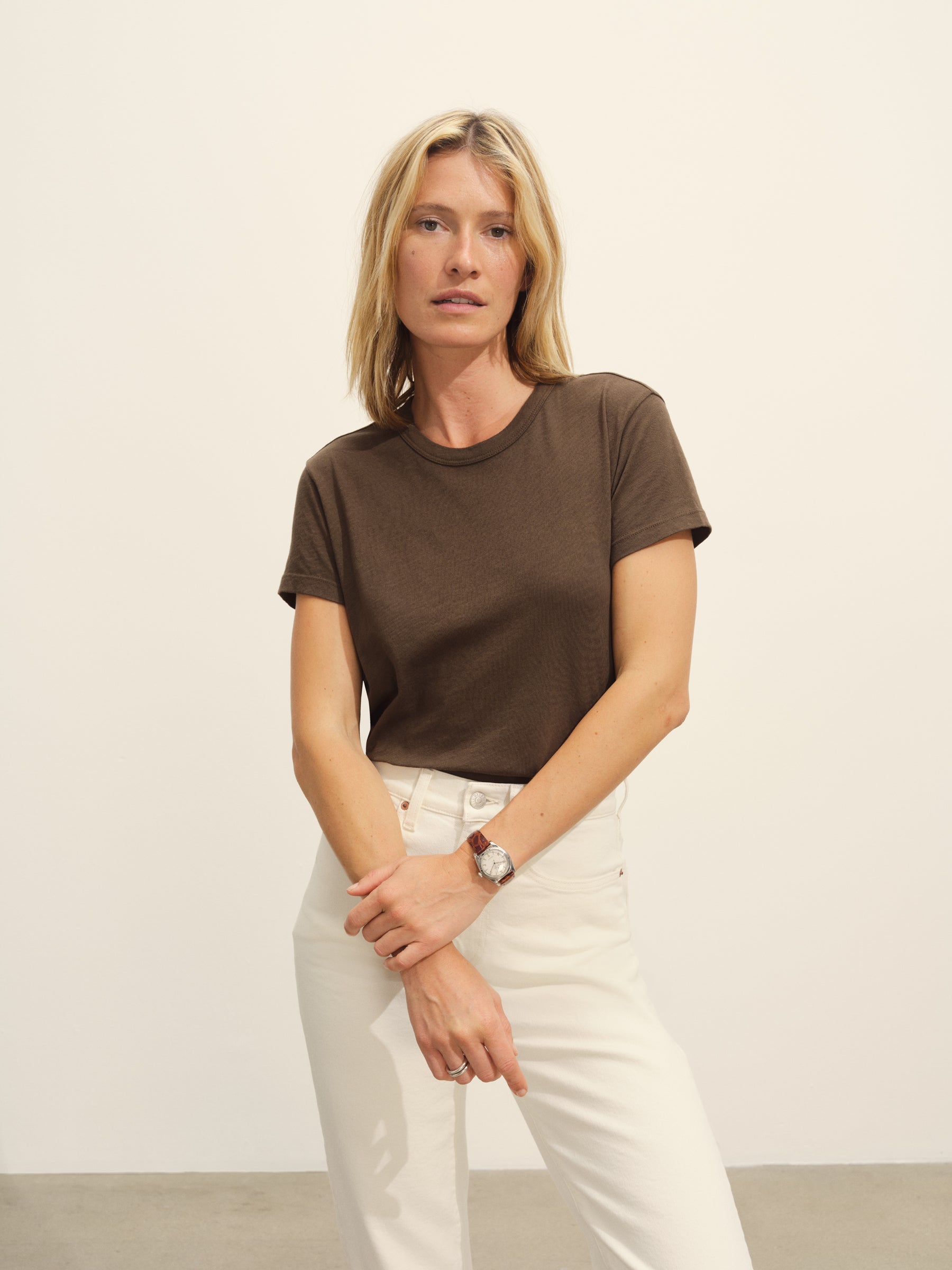 Classic fit short sleeve crewneck tee with a straight hem, cut from 125 GSM cotton with light slub texture. Constructed with self neck binding and ladder stitch detailing at the hems. Garment dyed and washed with softener for a lived in feel.