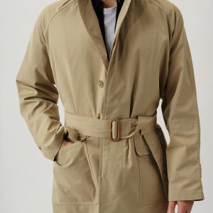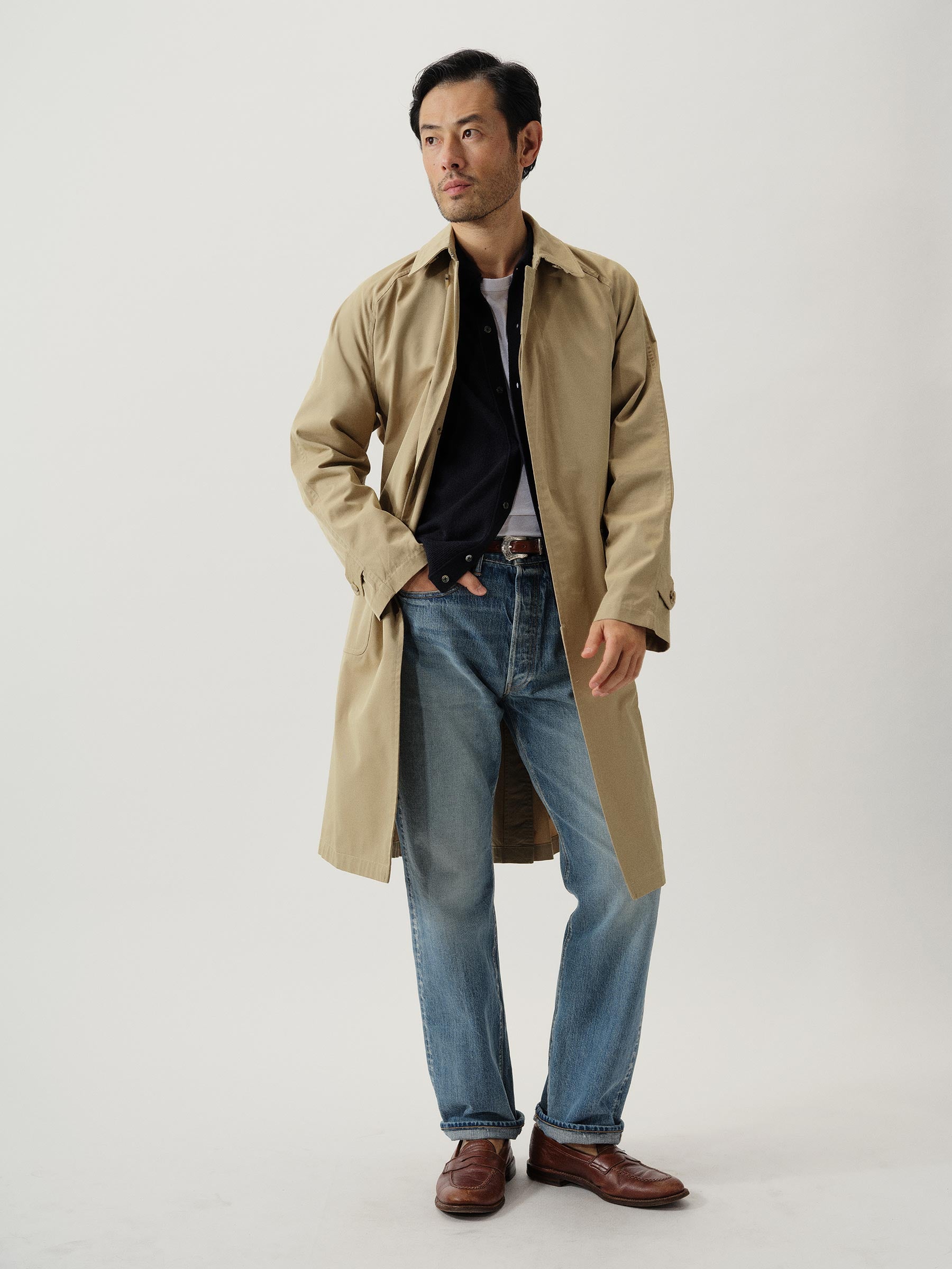 Relaxed, vintage-inspired trench coat cut from 5.7 oz yarn-dyed cotton/poly twill weather cloth with a DWR finish. Features patch and flap pockets, raglan sleeves, buttoned tab cuffs and throat, and a deep back vent. Includes a removable belt with leather buckle for cinching the waist.