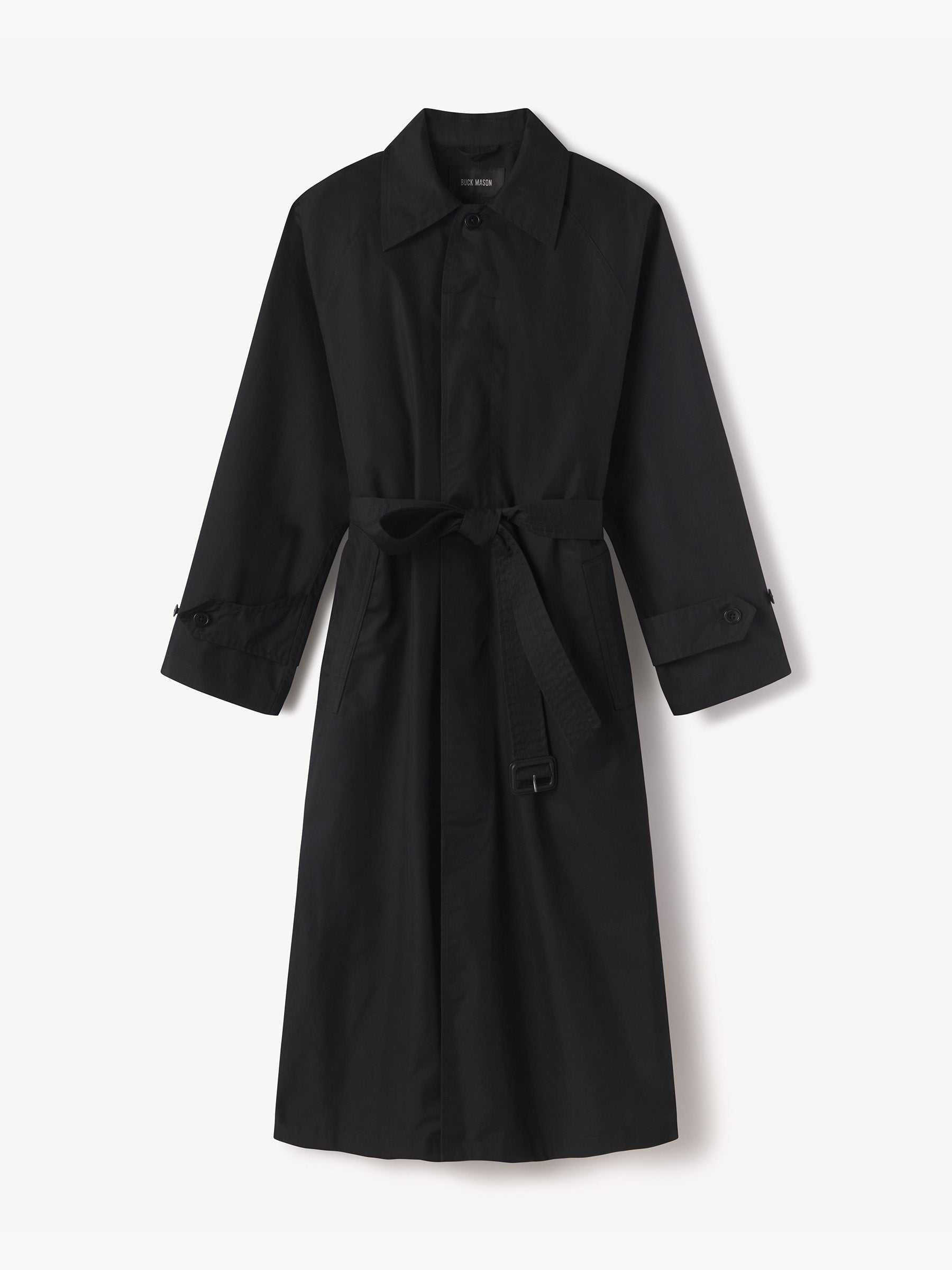 Relaxed, vintage-inspired trench coat cut from 5.7 oz. yarn-dyed cotton/poly twill weather cloth with a DWR finish. Features welt pockets, raglan sleeves, and a deep back vent. Details include a collar tab, button and tab cuffs, and a removable belt with leather buckle for cinching the waist. Size down for a more fitted silhouette.