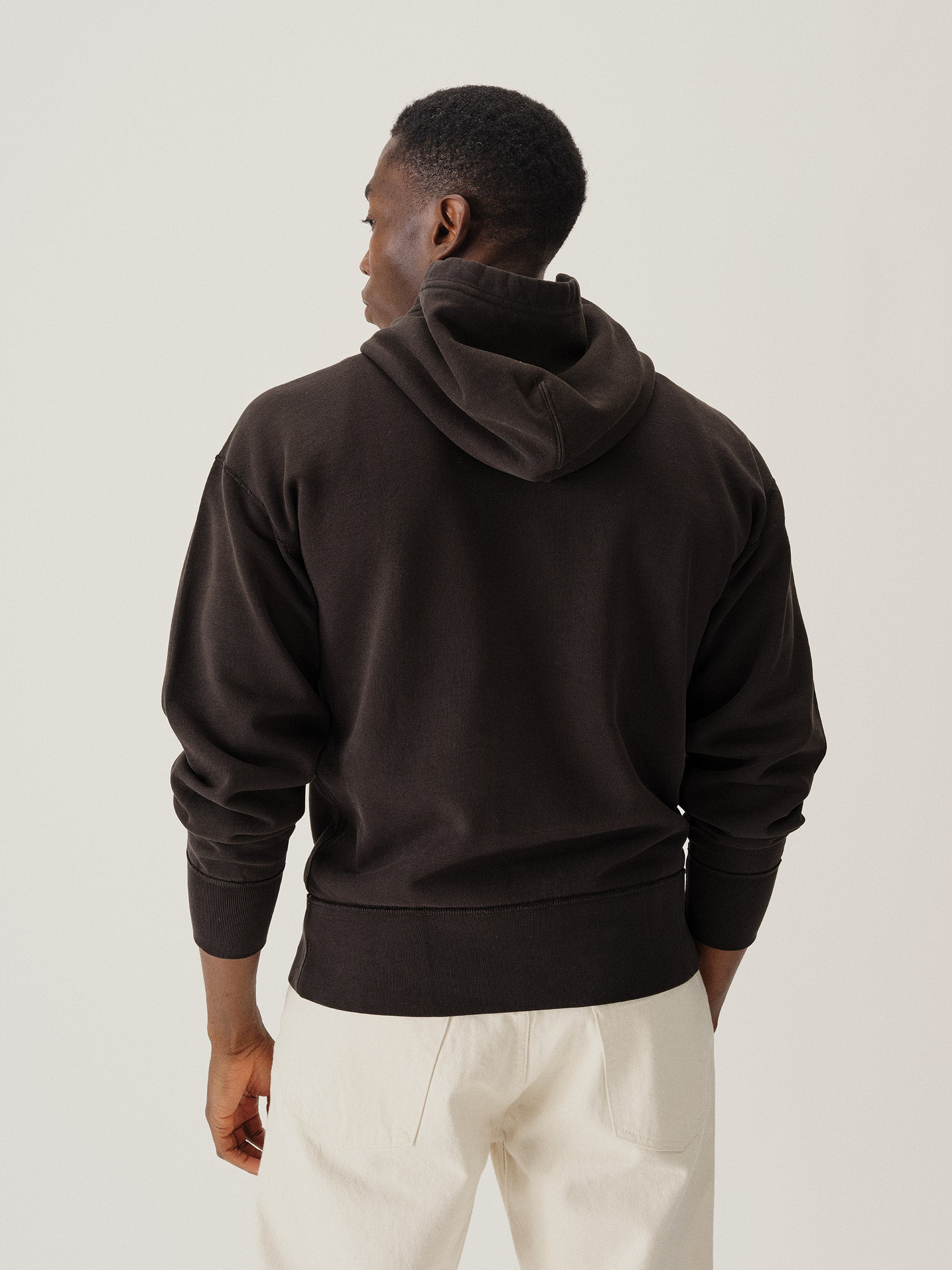 A midcentury-inspired hooded sweatshirt made from plush, not-too-heavy, not-too-light, welterweight French terry. Features a double-layer hood and kangaroo front pocket.