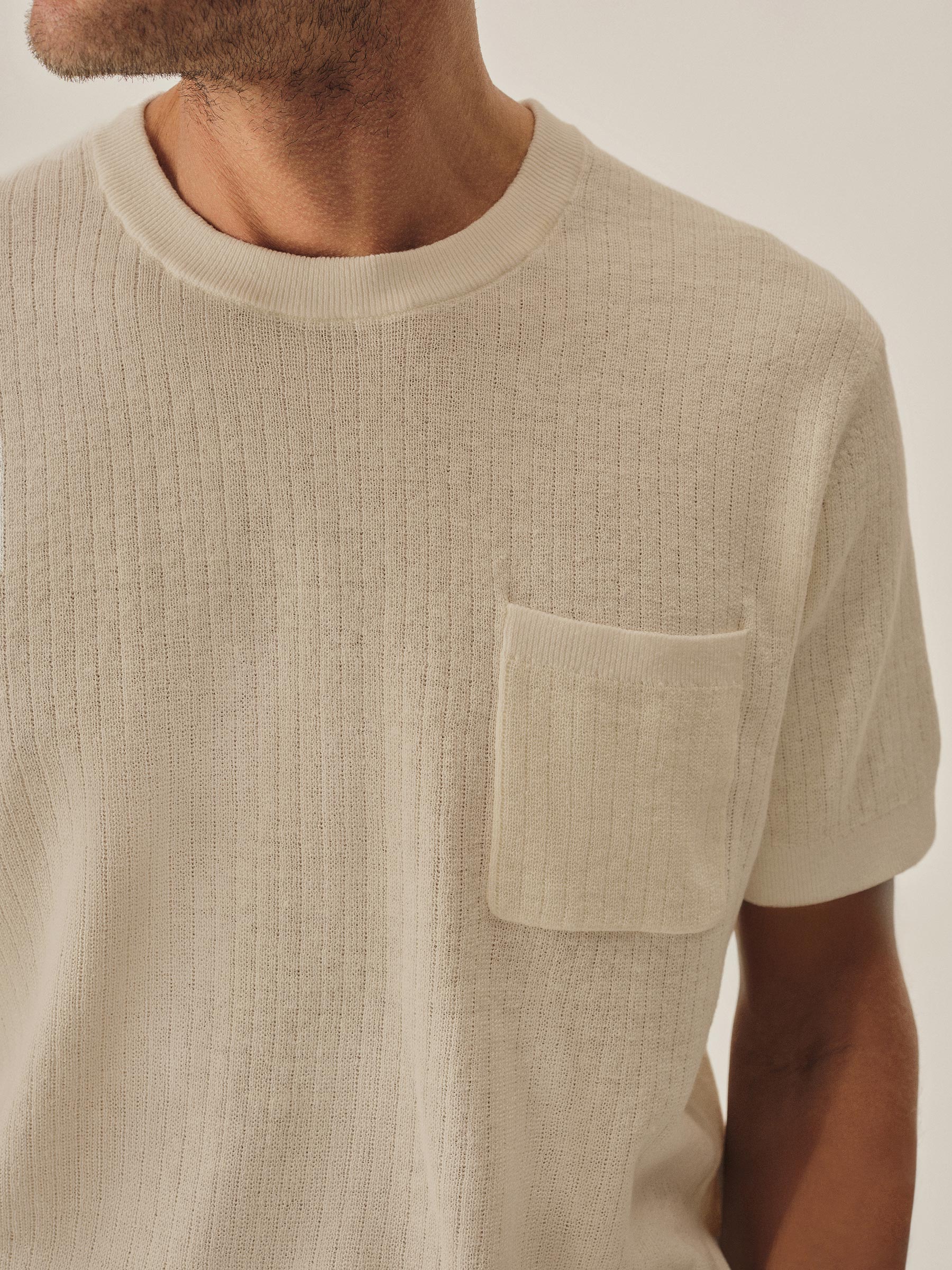 A classic fit tee in a fine knit drop-needle rib construction. Made from 12 gauge yarn-dyed hemp/cotton blend that wicks moisture and breathes easily. Chest pocket with ribbed opening. Finished with a 1×1 rib at collar, cuffs and waistband. A versatile summer layer inspired by vintage rib tees.